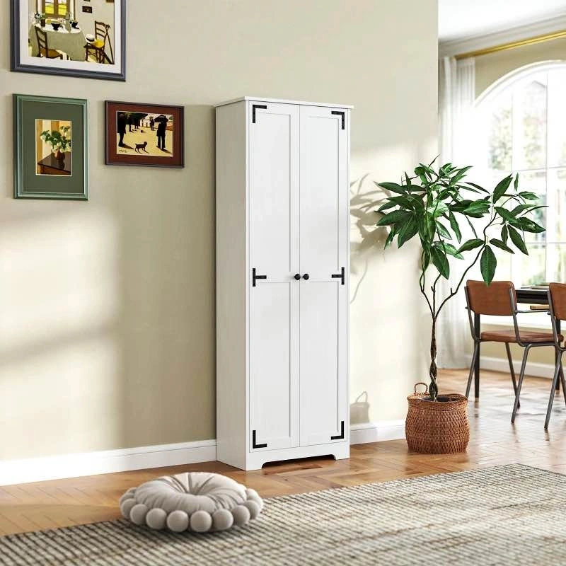 Brand new, assembled 67" Farmhouse Pantry Cabinet with 2 doors. Tall storage cabinet with adjustable shelves in a distressed white finish.