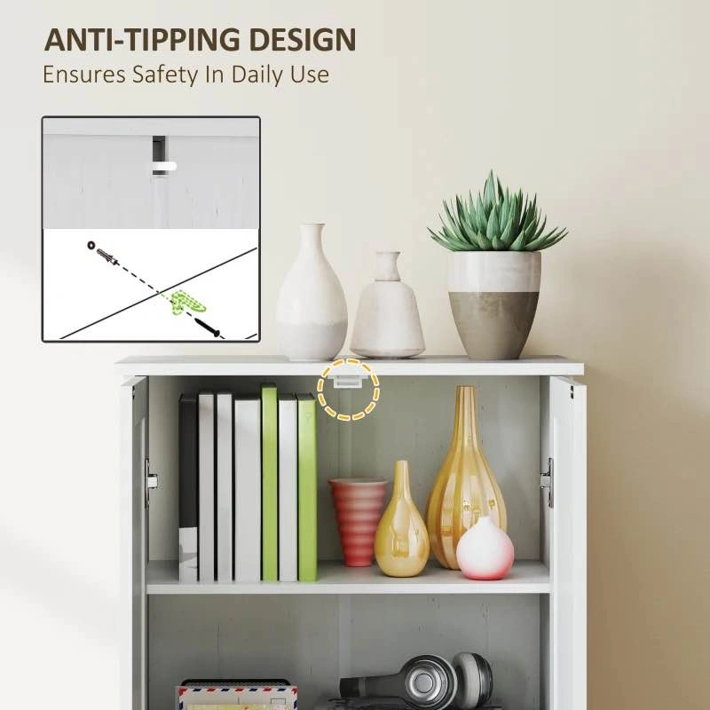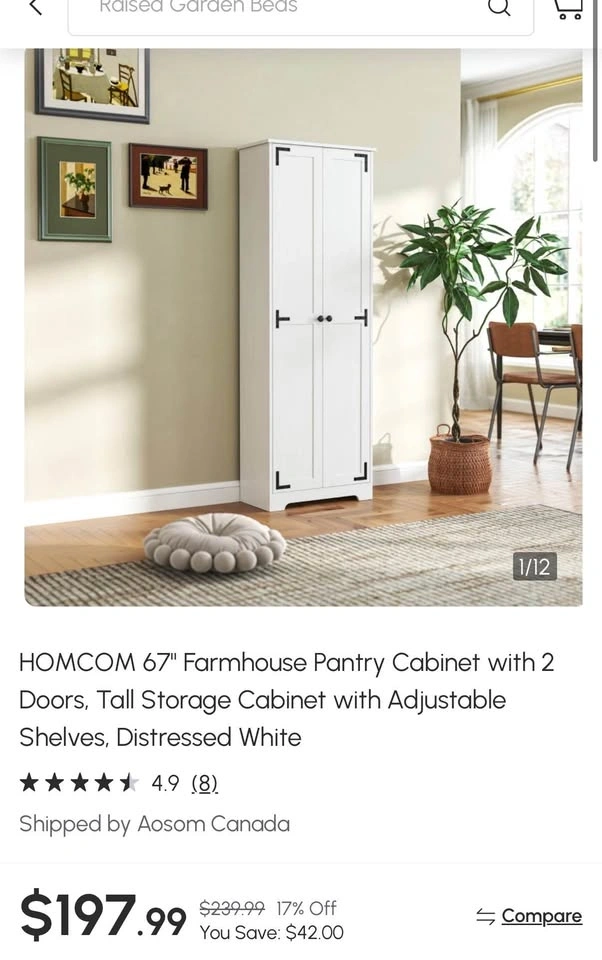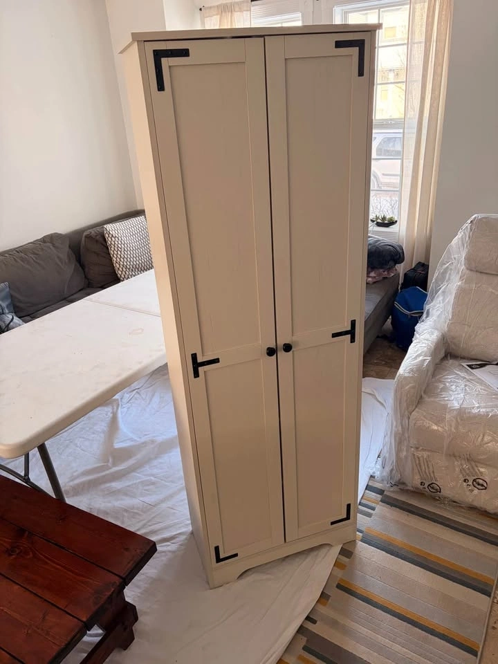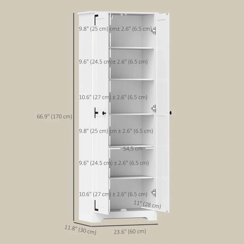 Brand new, assembled 67" Farmhouse Pantry Cabinet with 2 doors. Tall storage cabinet with adjustable shelves in a distressed white finish.