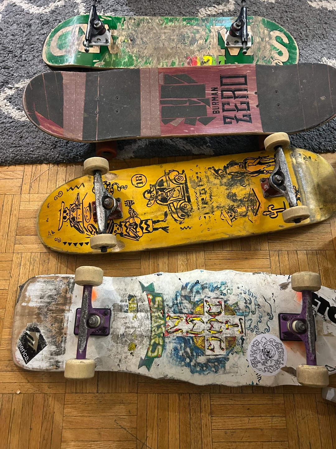 Bundle of four skateboards with assorted graphics. Includes a Zero Burman deck, a yellow deck with graphics, a green deck, and a white deck with a large graphic and stickers. Trucks and wheels are included on all boards.