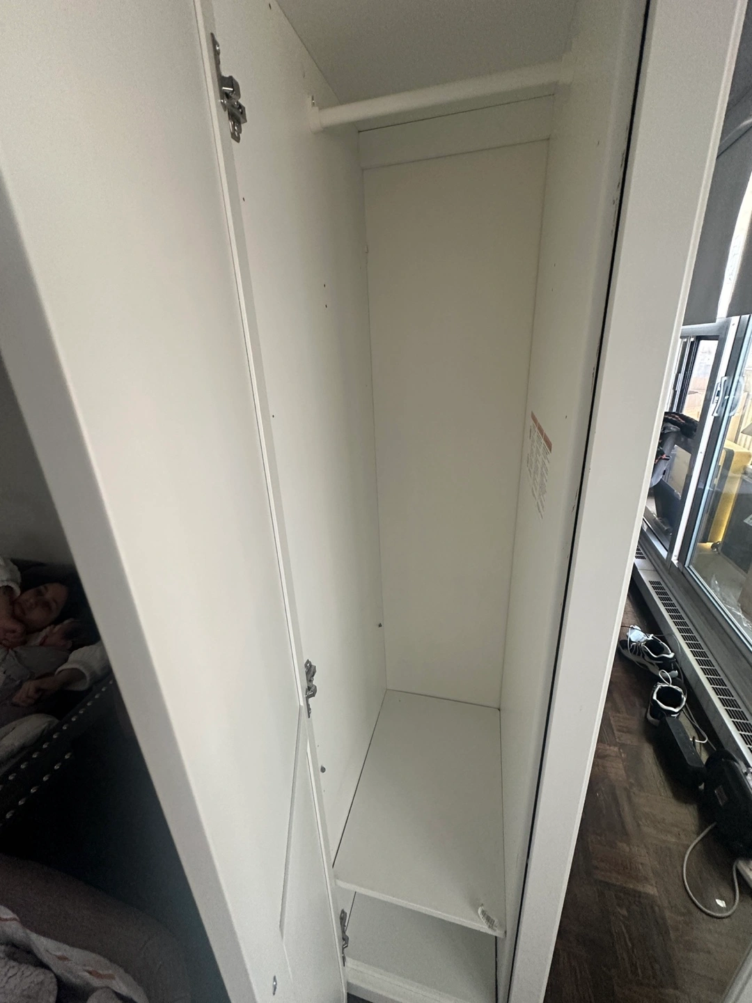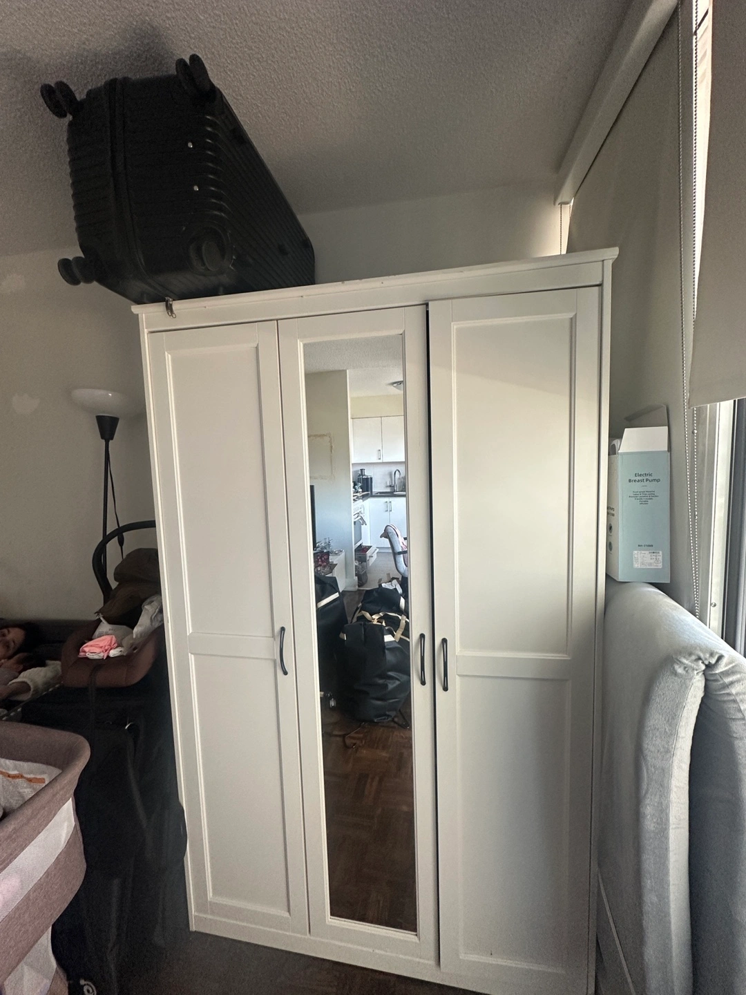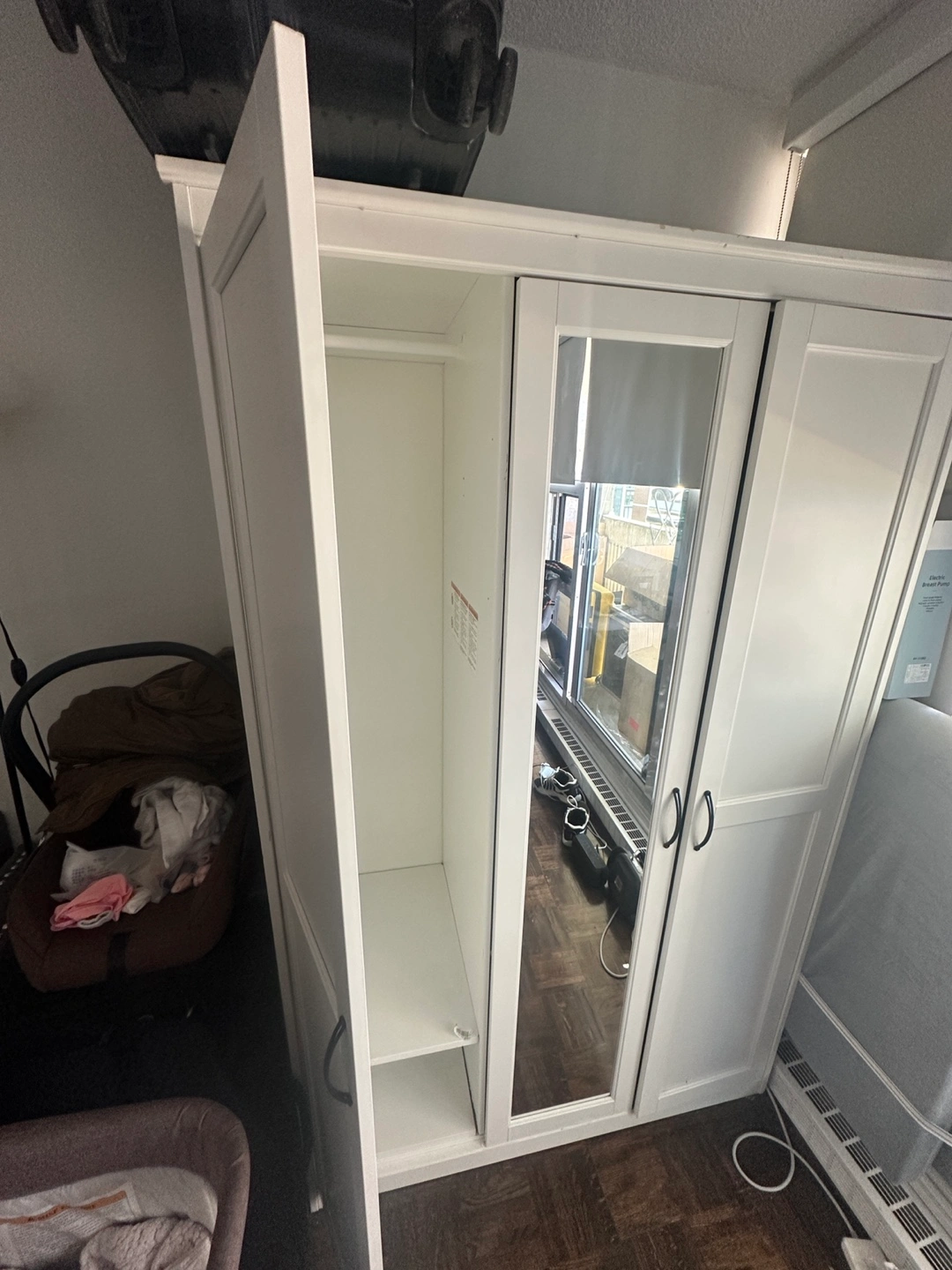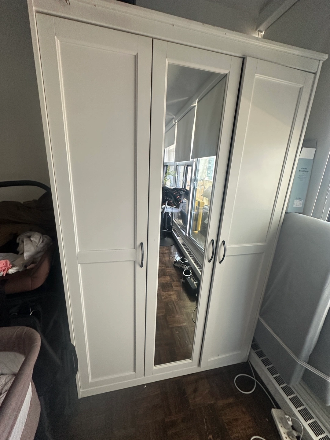 Three-door wardrobe. Centre door features a mirror. Two shelves and a hanging rod. Good for small spaces. White finish…Needs to be picked up today or tomorrow morning