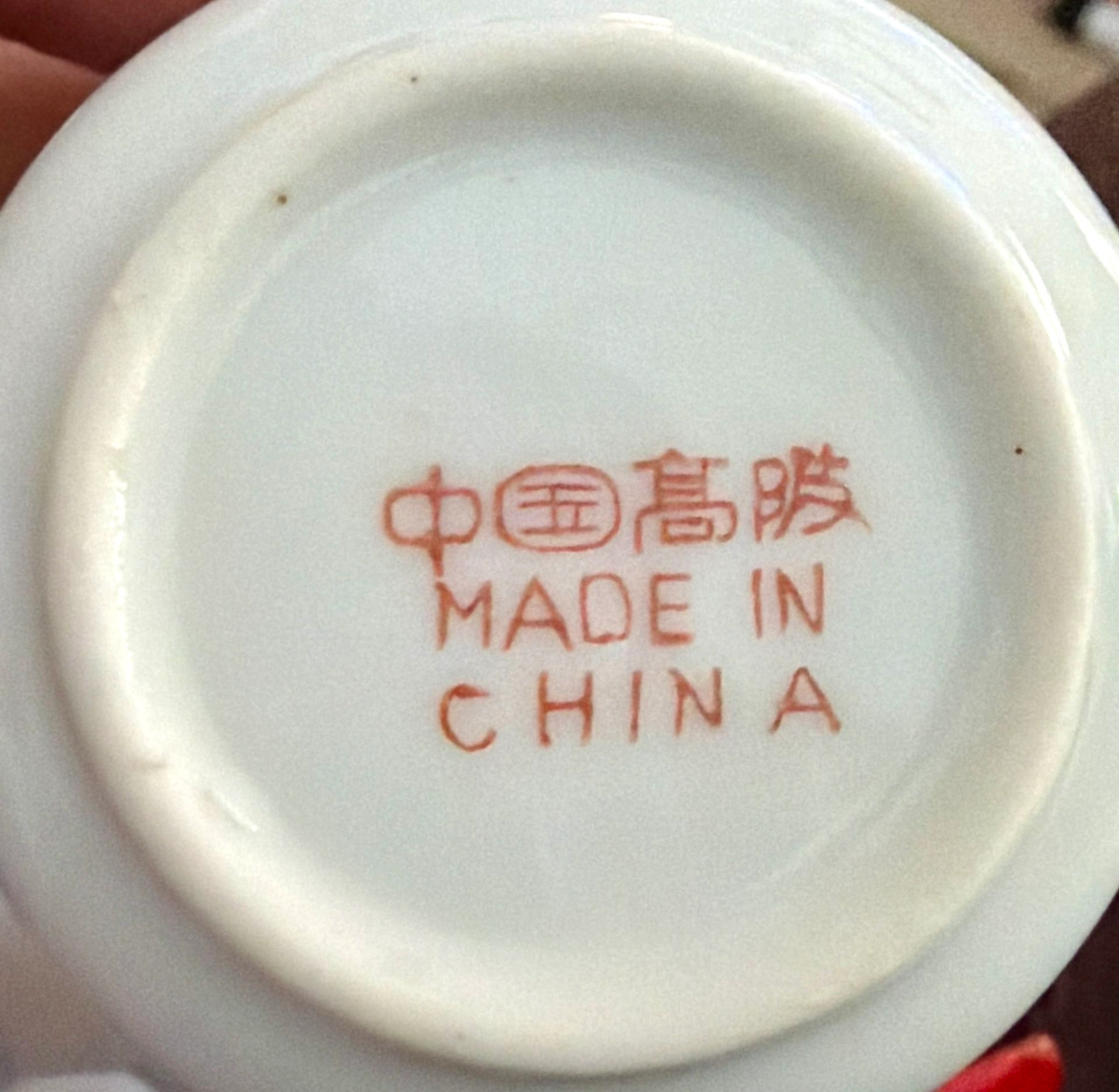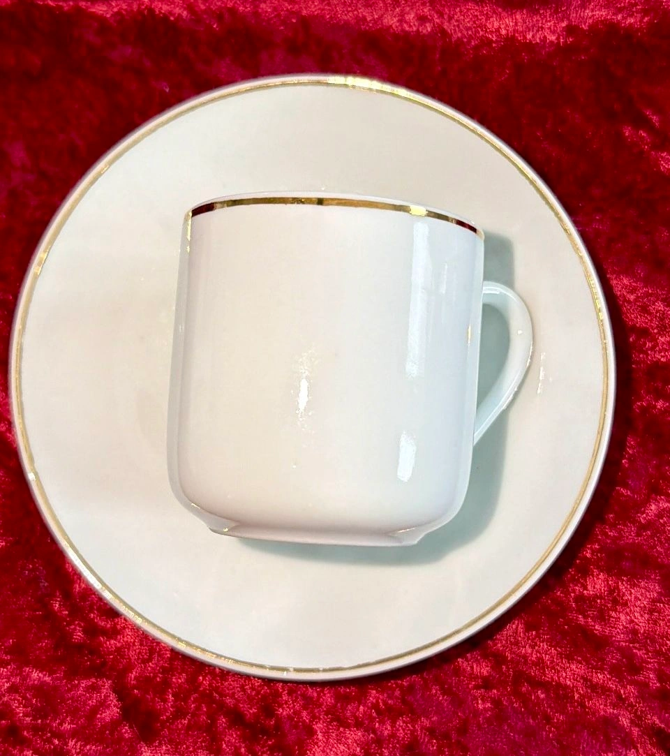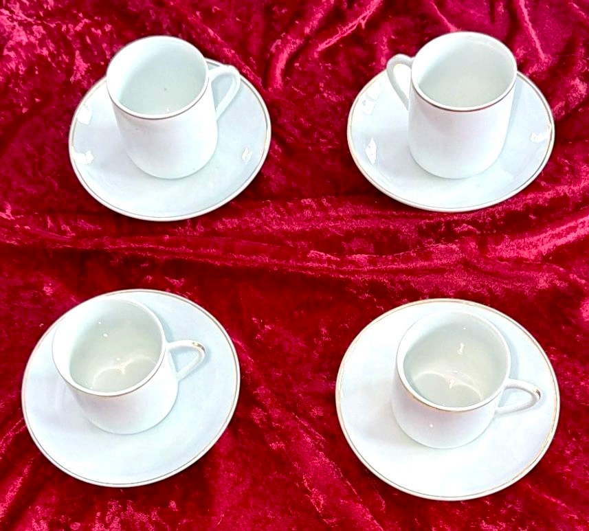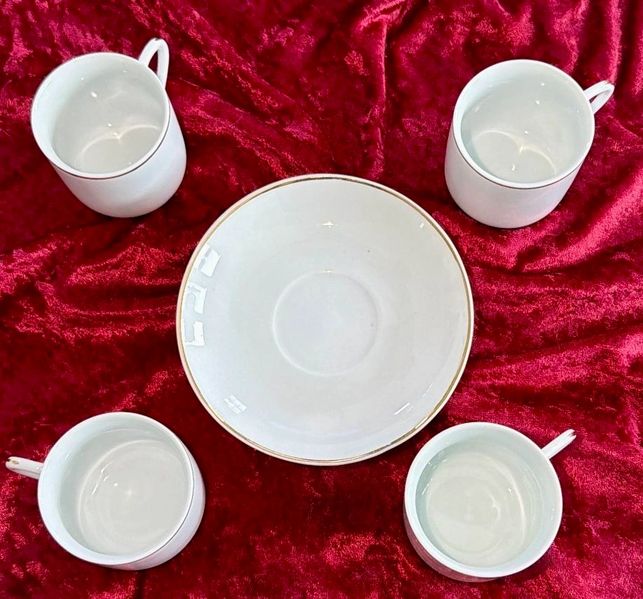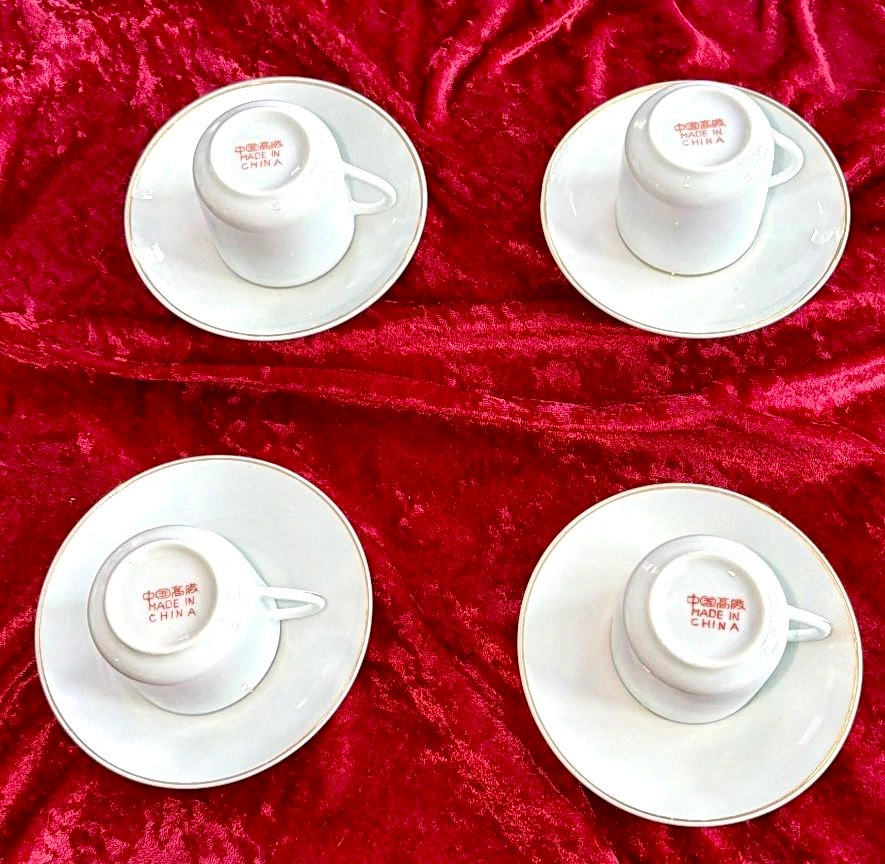 Beautiful vintage Chinese porcelain demitasse cup set featuring a classic white glaze with elegant gold trim. This set includes four (4) matching cups and four (4) coordinating saucers, perfect for espresso, tea, or display. Marked on the bottom “中国高胜 / MADE IN CHINA” (Gaosheng), indicating late 20th-century Chinese export porcelain. A timeless, minimalist style that works well for entertaining, vintage décor, or replacement pieces. Details: Maker: Gaosheng (China). Era: Vintage (circa 1970s–1990s). Material: Porcelain. Color: White with gold trim. Includes: 4 cups + 4 saucers. Condition: Very good vintage condition, no cracks or chips. Approximate measurements: Cup: 2 1/2” Tall, 2” Diameter, holds approx. 1/3 cup. Saucer: 4 3/4” Diameter. This set has been in storage for many years! Buyer must pick up from the Morton Grove Area.