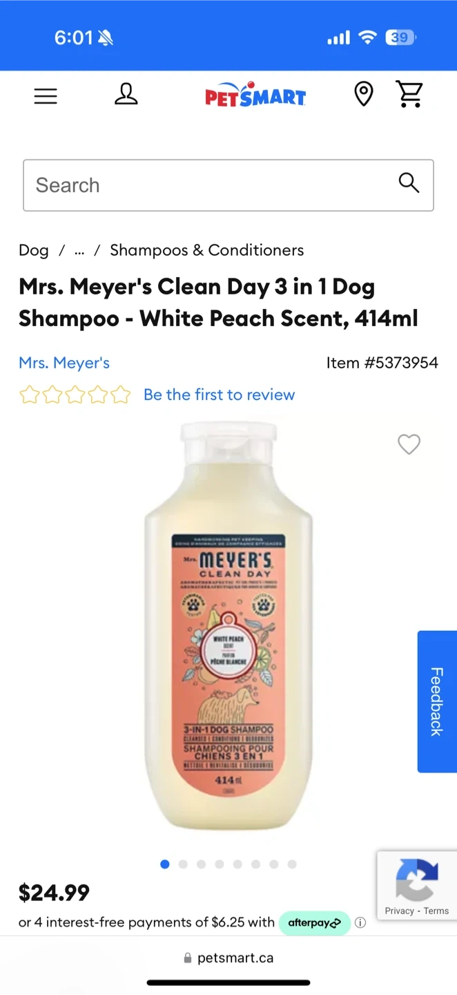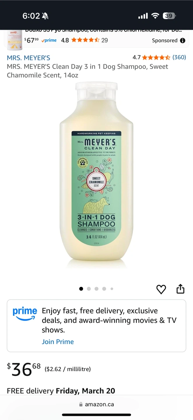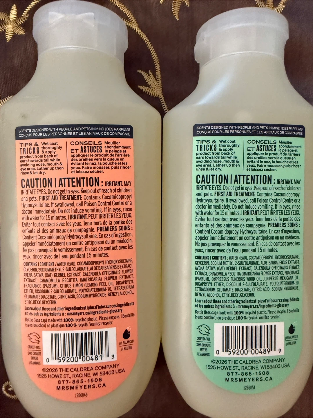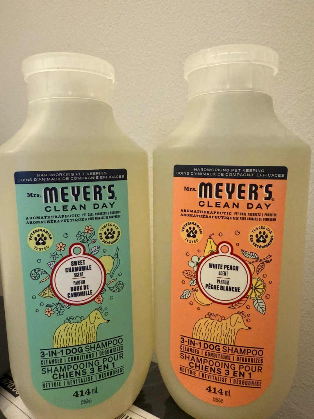 Brand new Mrs. Meyer’s Clean Day 3-in-1 Dog Shampoo & Conditioner (414 ml). Never opened – selling because I no longer need them. This gentle formula cleans, conditions, and deodorizes your dog’s coat while leaving a fresh scent. Made with ingredients like oat extract, aloe, and chamomile to help keep your dog’s coat soft and shiny. Available scents: • White Peach • Sweet Chamomile ✨ Features • 3-in-1 formula (clean, condition, deodorize) • Veterinarian-tested & pH balanced for dogs • Made without parabens, phthalates, or artificial dyes • Large 414 ml bottle 💲 Price: • $20 each • $35 if you take both