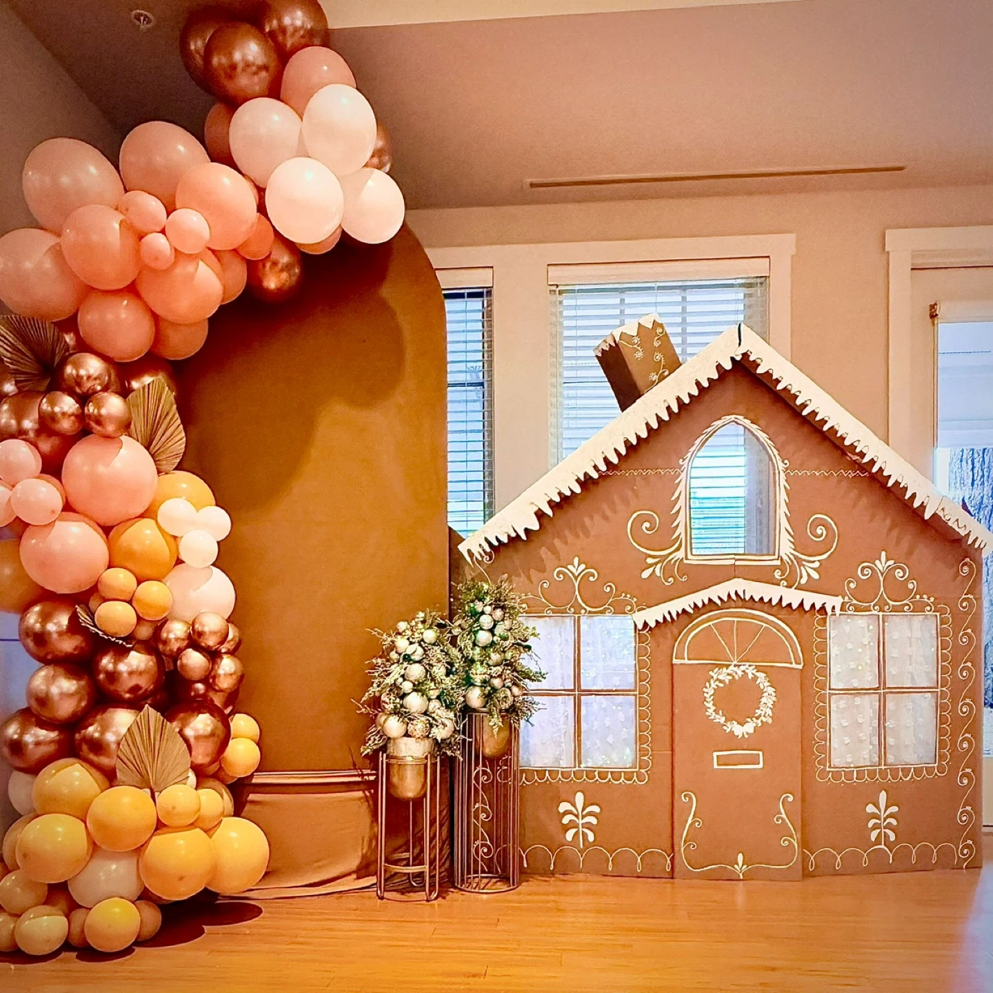 This cardboard gingerbread photo prop is perfect for Christmas picks . It's decorated with festive white details and a wreath on the door! It's a fun addition Christmas decor.