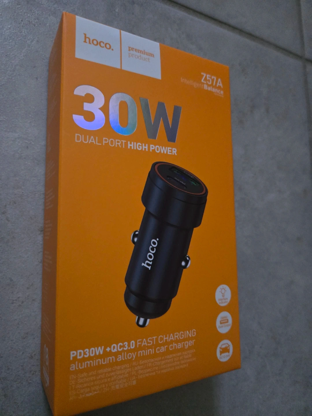 This is a Hoco Z57A car charger with PD30W + QC3.0 fast charging capabilities. It's made from aluminum alloy and has a dual port design. Its compact size makes it a mini car charger.