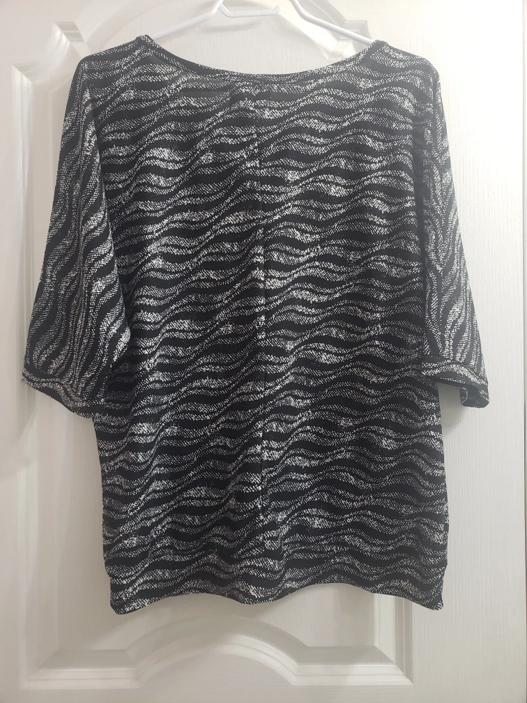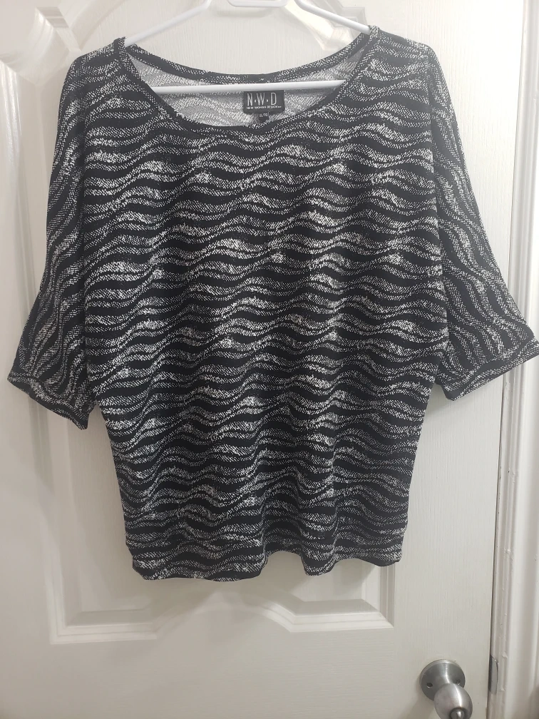 This NWD top features a wavy black and silver patterned design. It's a size XL/TG. Perfect for adding a touch of sparkle to your outfit!