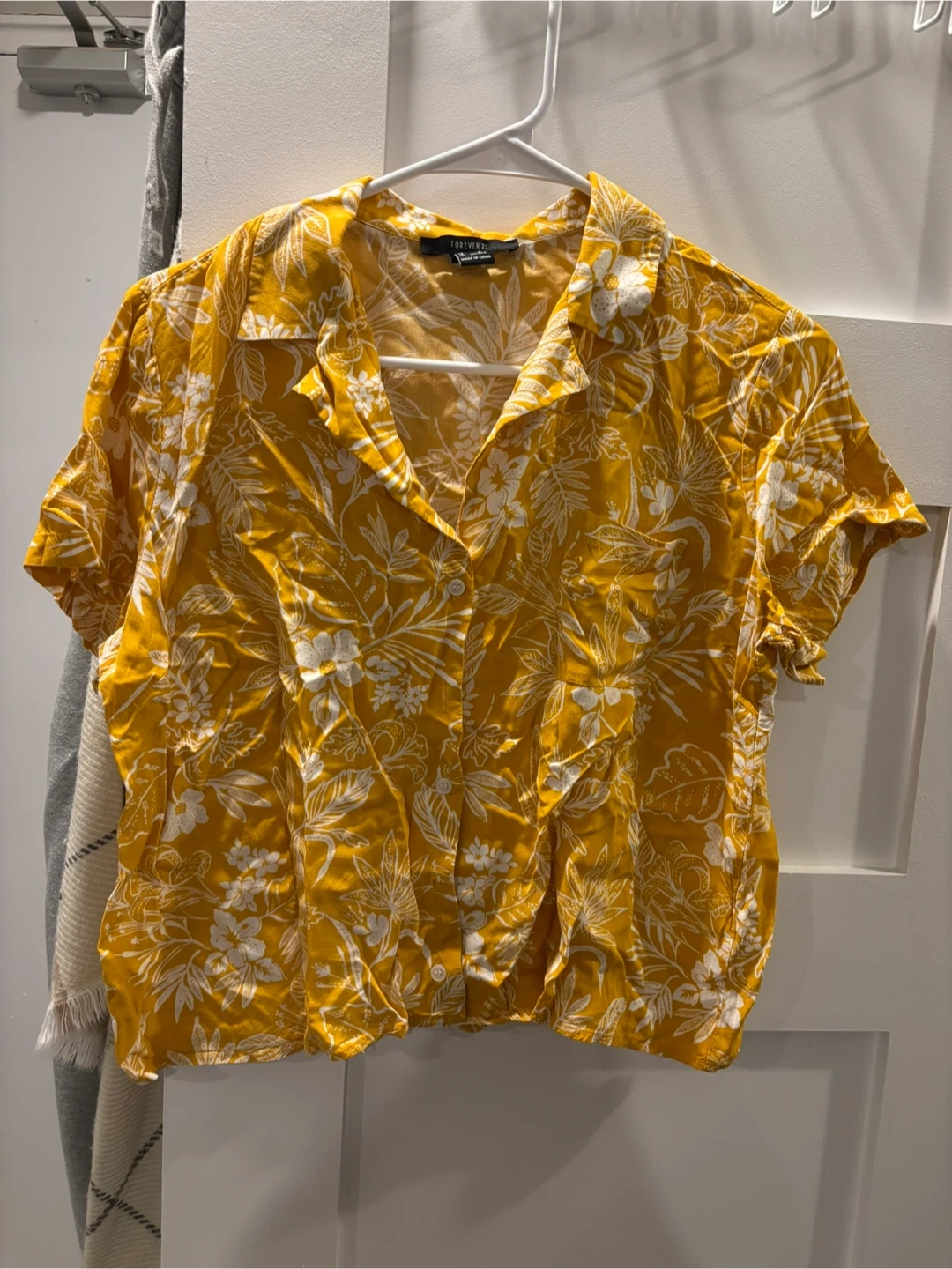 Forever 21 short sleeve button-up shirt with a yellow base and white floral pattern. It has a collared neckline and a button front closure. This top is made from a lightweight fabric.