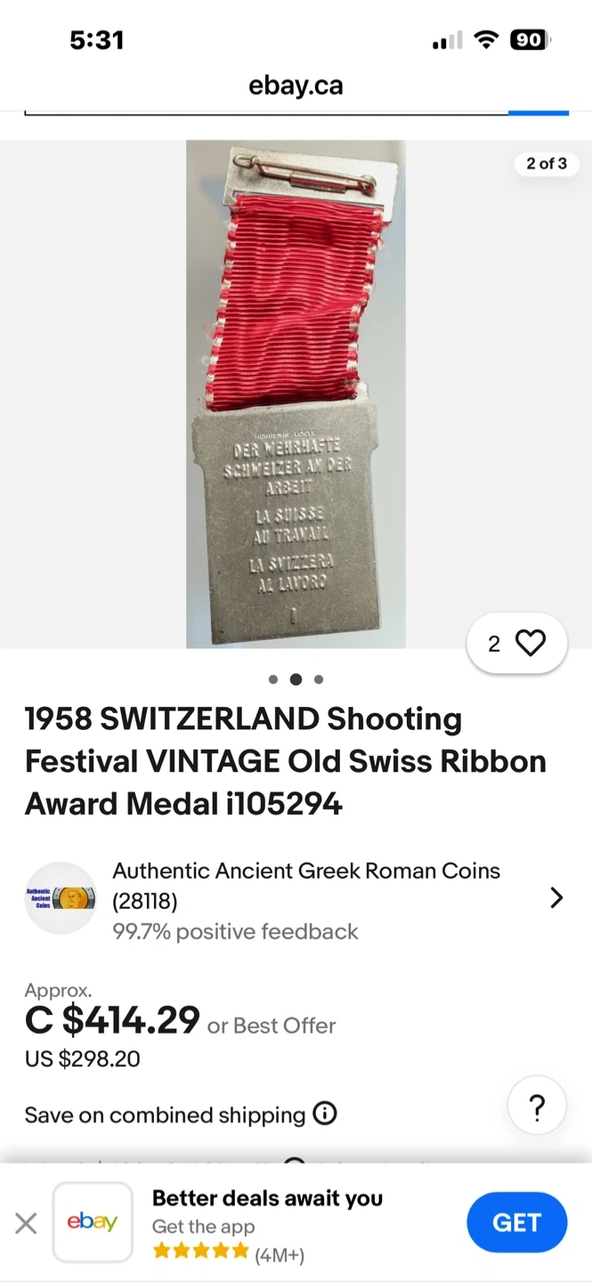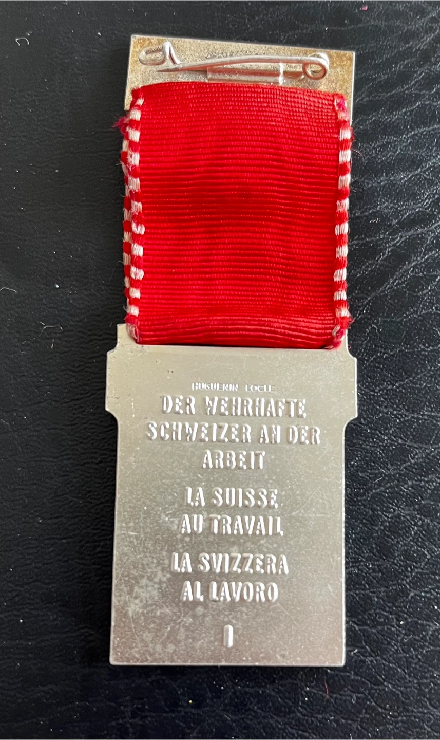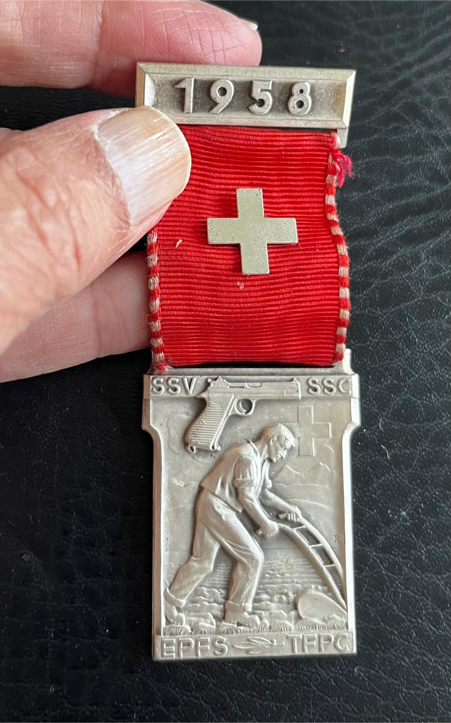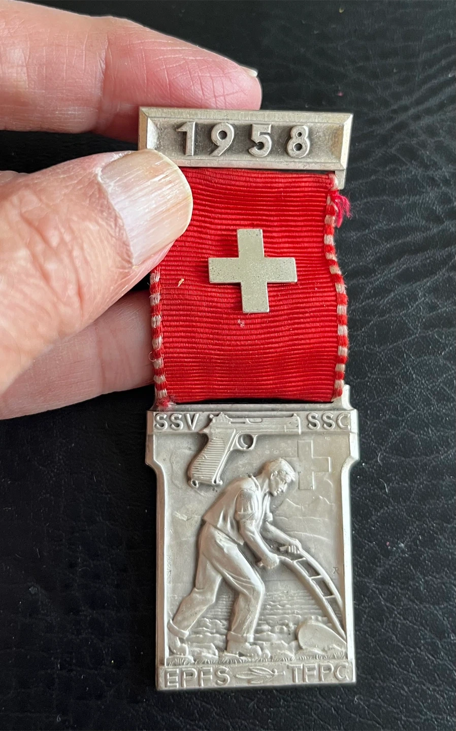 A vintage medal from the 1958 Swiss Shooting Festival. It features a red ribbon with a Swiss cross and a silver emblem depicting a man working with tools, along with a handgun. The inscription on the back is in German, French, and Italian.