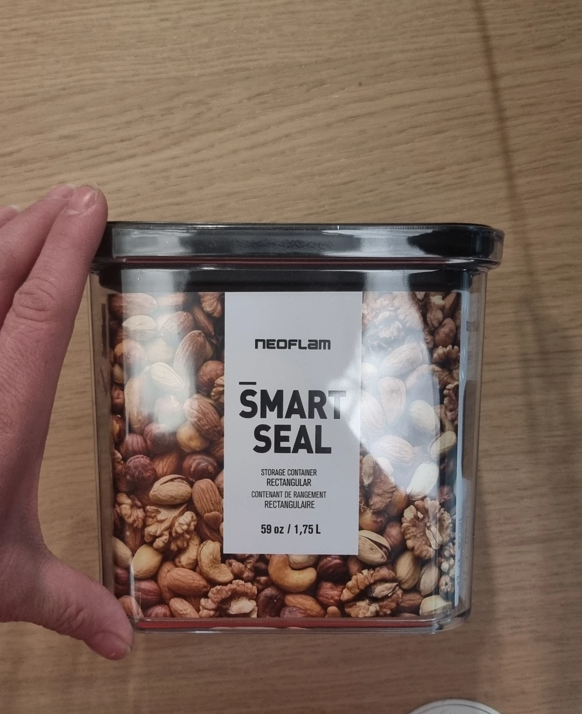 Neoflam Smart Seal rectangular storage container. It's 59 oz or 1.75 L. This container has a watertight, leak-proof seal created by a simple twist. Dishwasher safe and BPA-free.