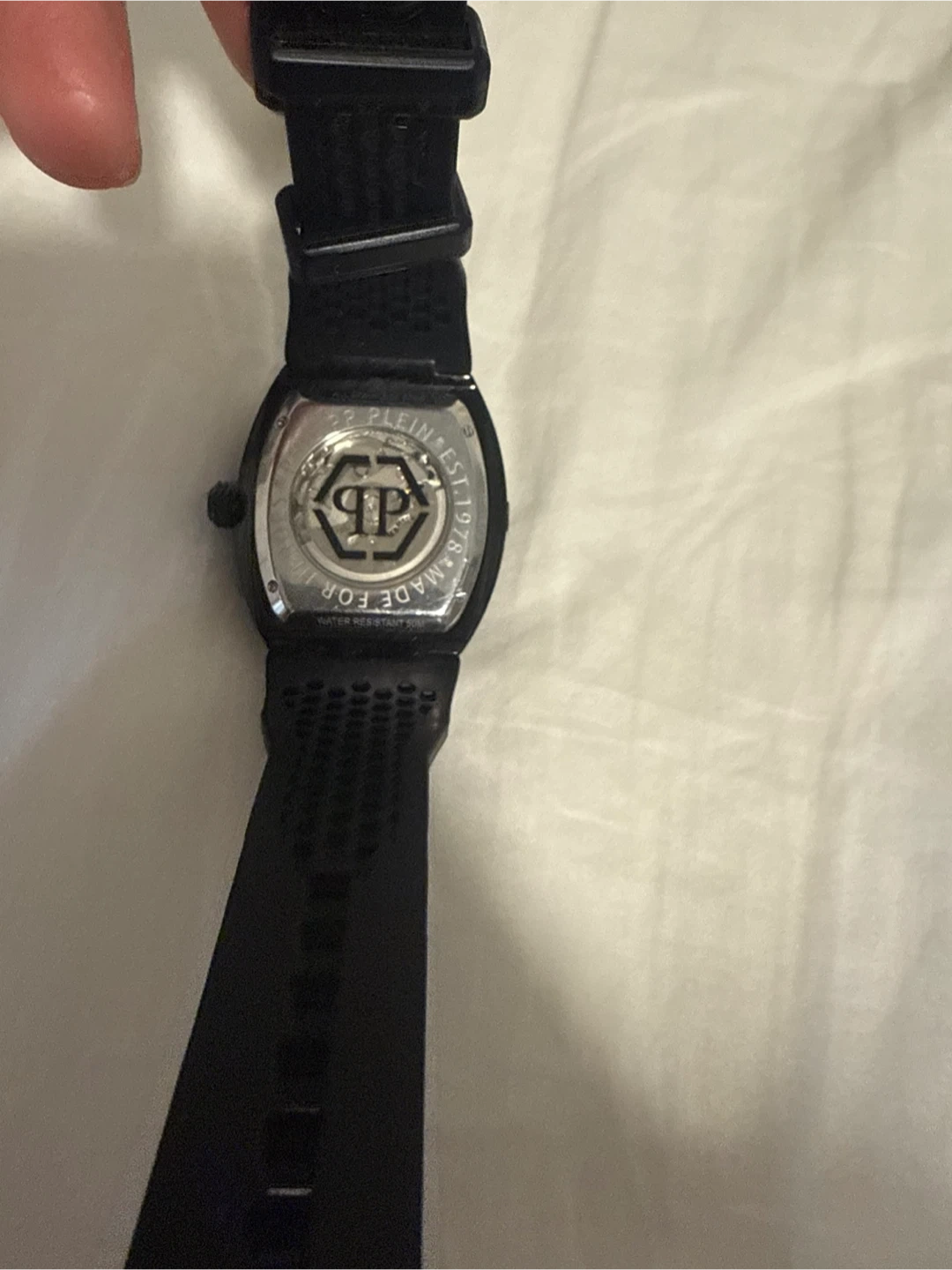 This is a black Philipp Plein watch with a distinctive "PP" logo on the back. It features a textured strap and a unique dial design. Water resistant.