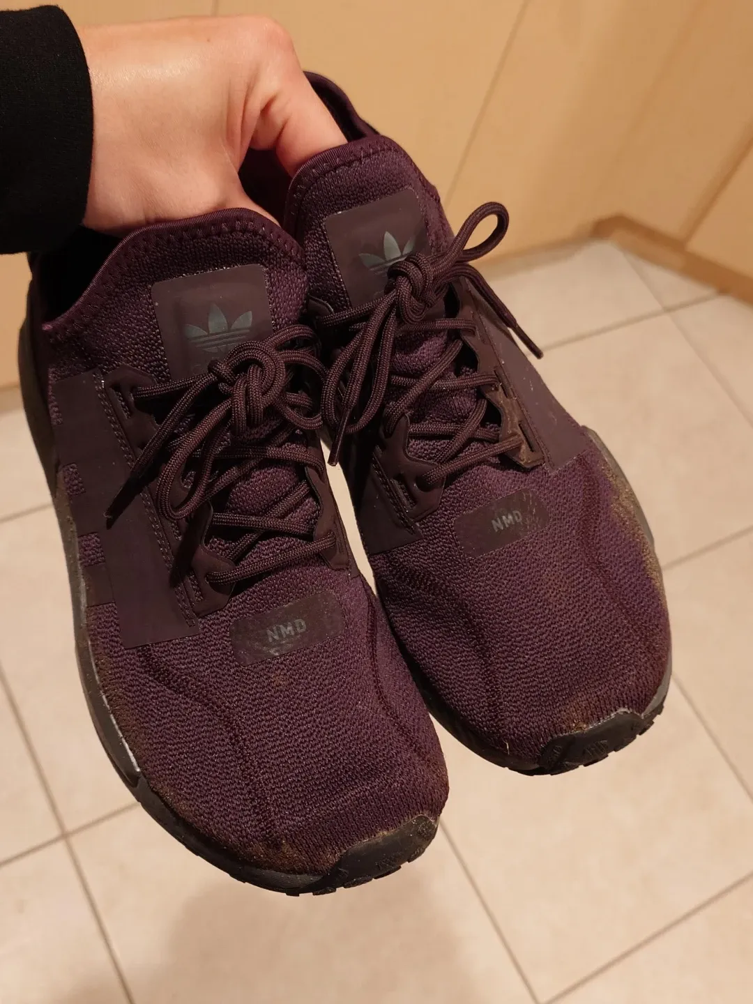 Burgundy Adidas NMD sneakers with "Balls" insoles. These shoes are made with a breathable knit upper and feature a comfortable Boost midsole. They're perfect for everyday wear or light athletic activity.