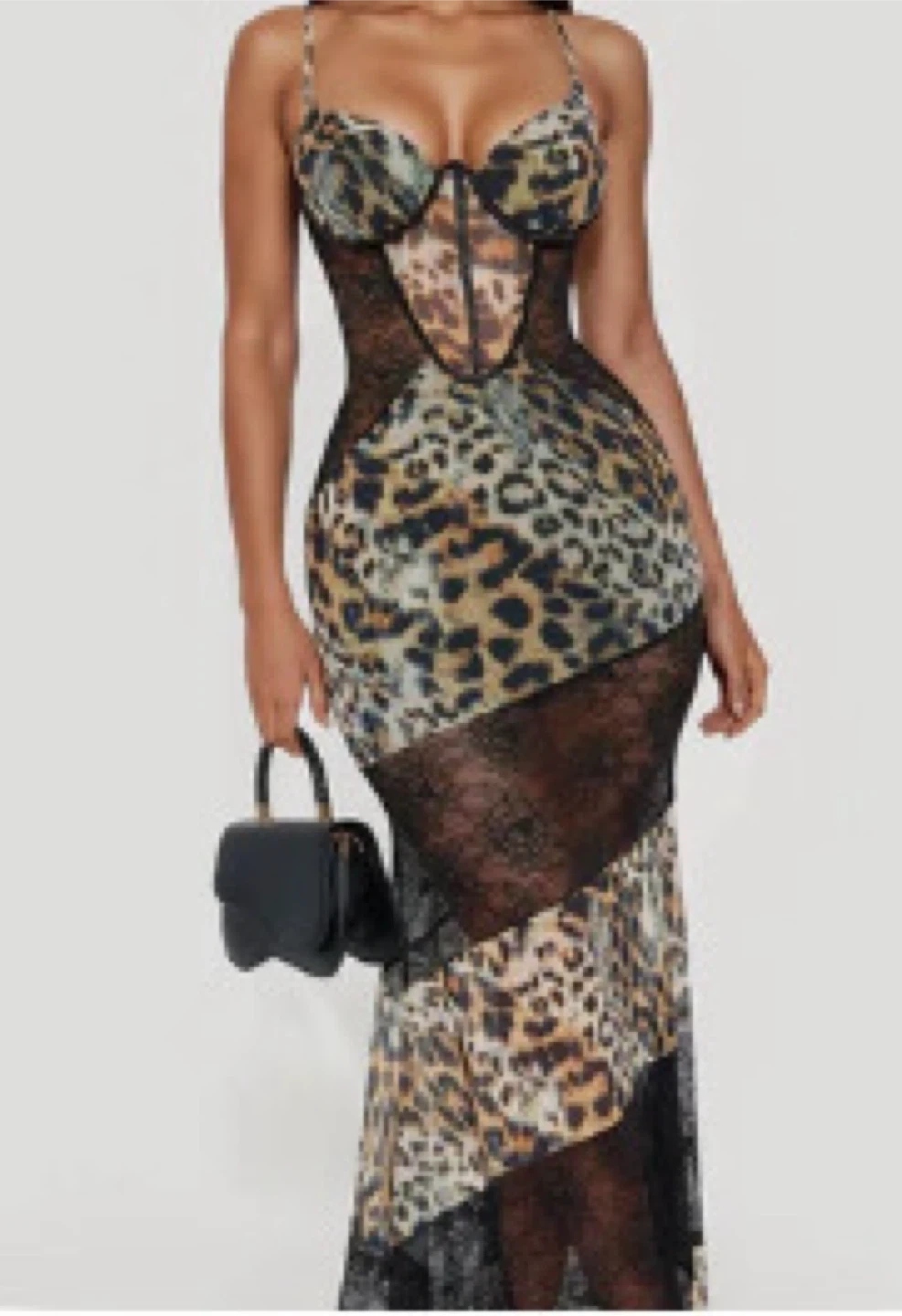 This maxi dress features a bold leopard print with sheer lace detailing. It has a flattering corset bust and a flowing asymmetrical hem. It's a statement piece for a night out!