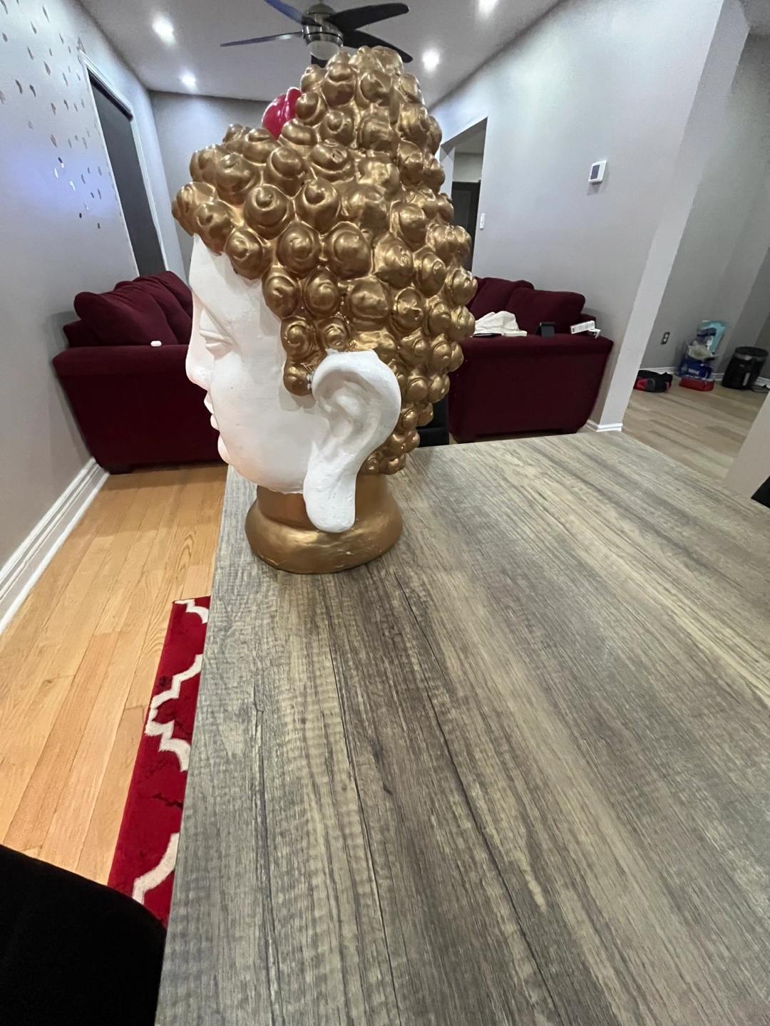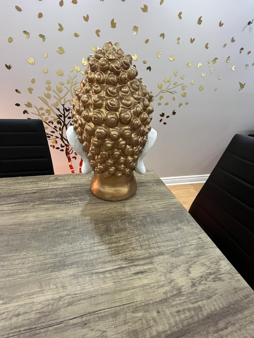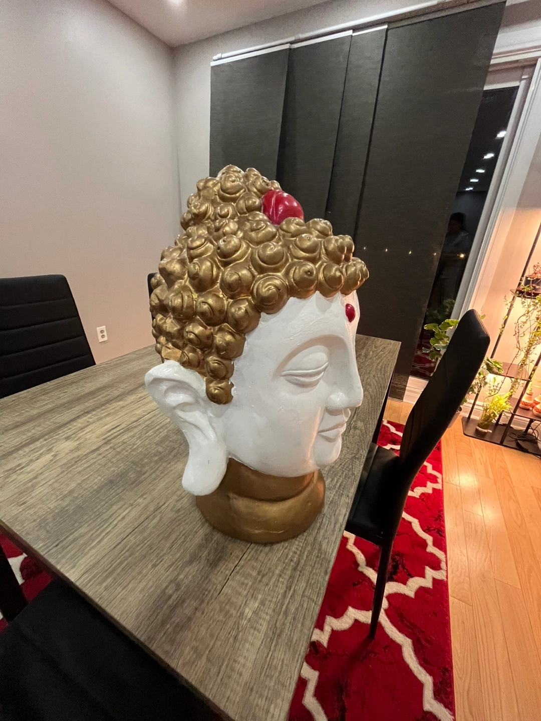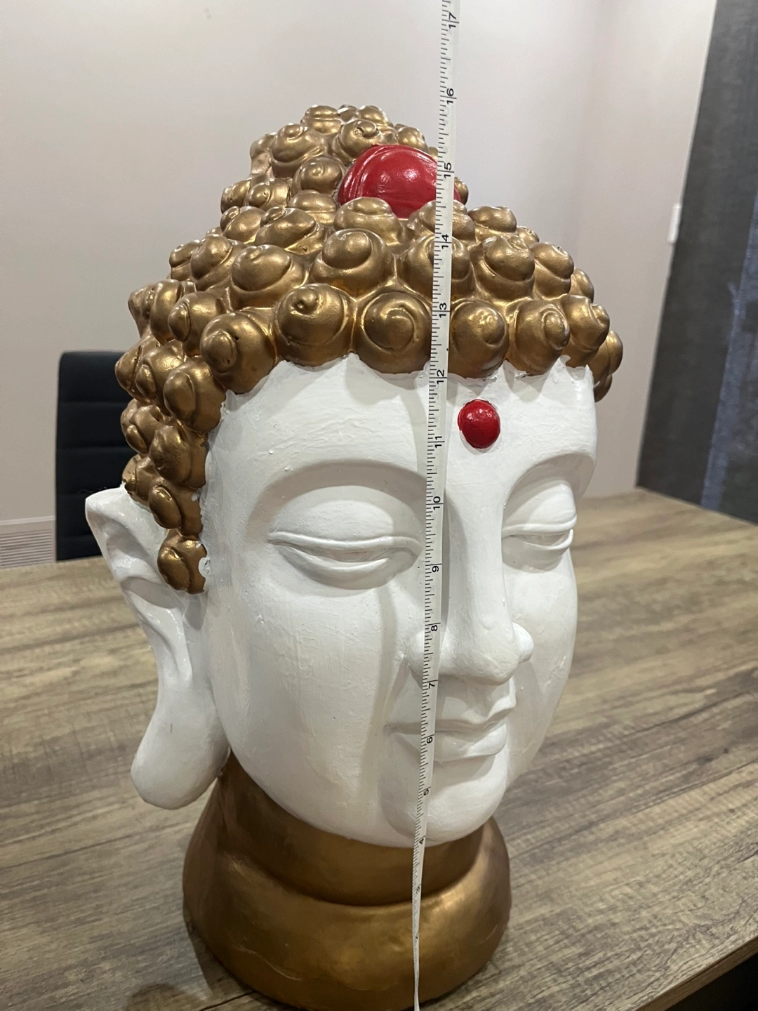I am selling this Buddha head statue. It has a white face with a gold base and hair. A red dot on the forehead. This statue is sure to provide a sense of peace to any space in your home.