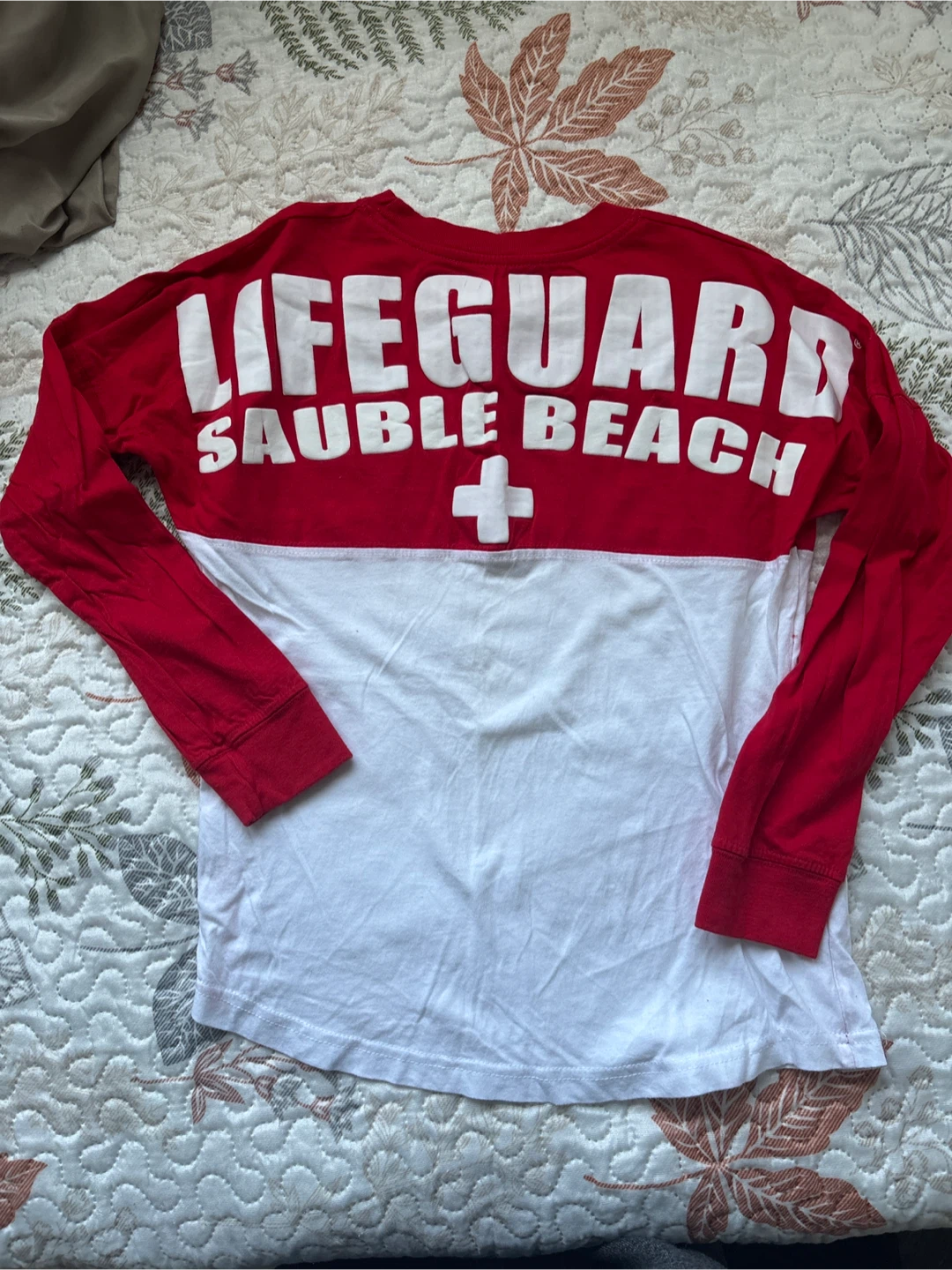 Selling an adorable Lifeguard Sauble Beach 3/4 sleeve shirt in size medium! (Fits more like a small or xs) The shirt is red and white and made of 100% cotton. It's in great condition. Some vinyl cracking on the “G” on the back but not visible when worn