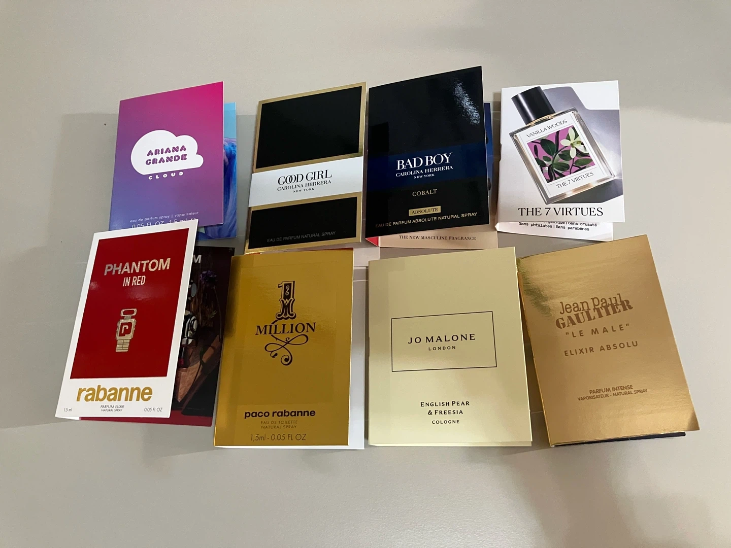 Designer perfume samples. It includes scents from Ariana Grande, Carolina Herrera, Paco Rabanne, Jo Malone, and Jean Paul Gaultier.