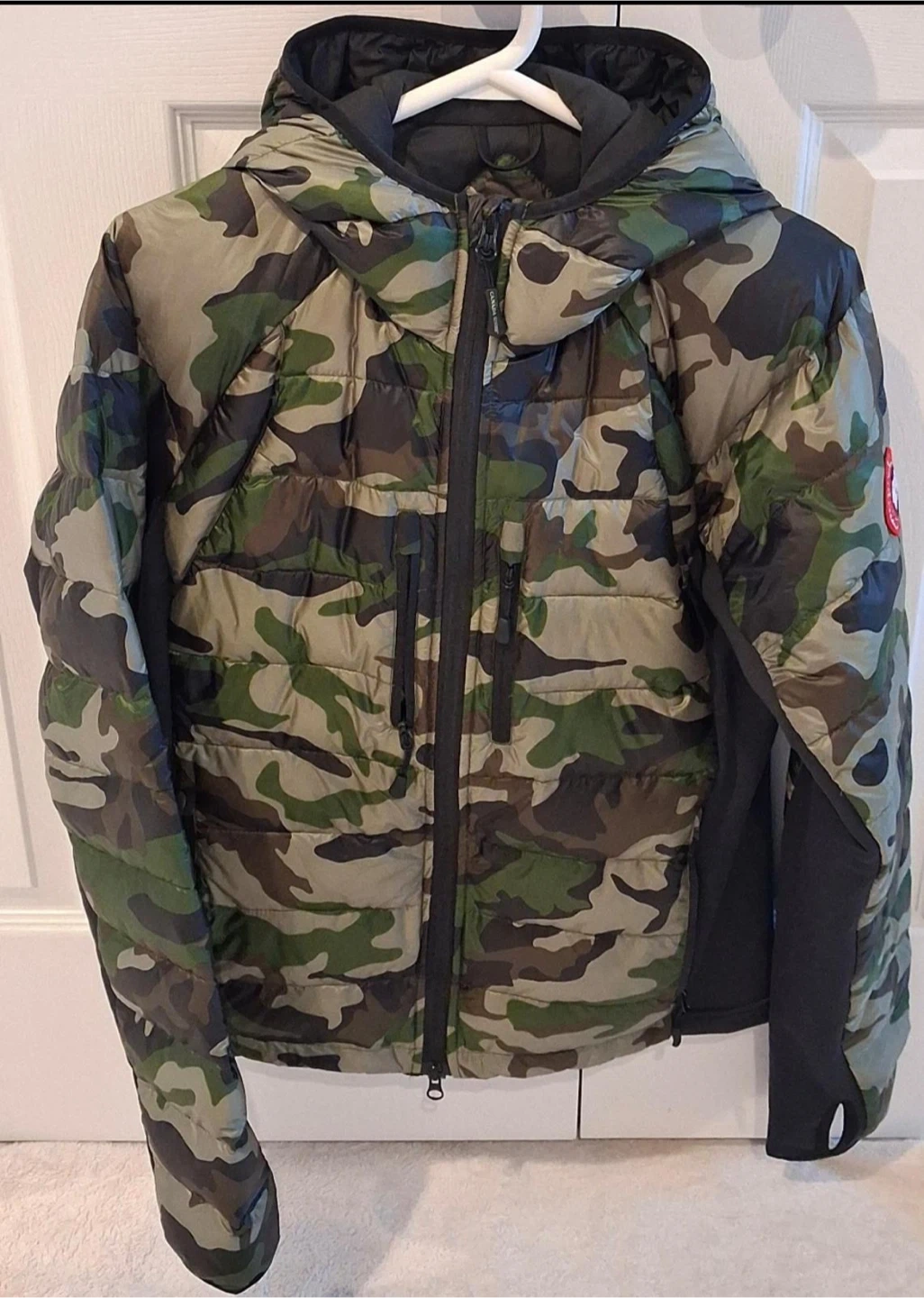 This is a Canada Goose puffer jacket in a camouflage pattern. It's a size medium. The jacket is made with durable materials and features a hood.like new conditions asking $300 f