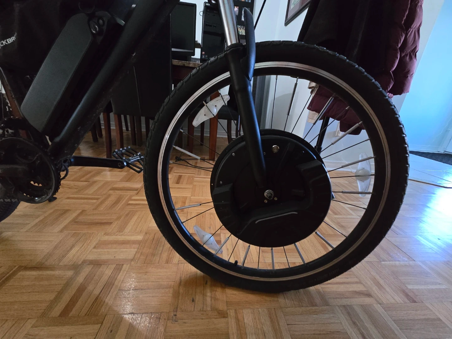 This custom dual e-bike is truly exceptional. It features custom grips and wheels, and its two motors work in tandem to deliver impressive speeds. It remains in excellent condition, riding as well as it did on the first day. Due to an upcoming move to another country, I am unfortunately unable to keep it. If this advertisement catches your eye, I encourage you to send me a direct message; it is an incredibly enjoyable ride. Fun asf!