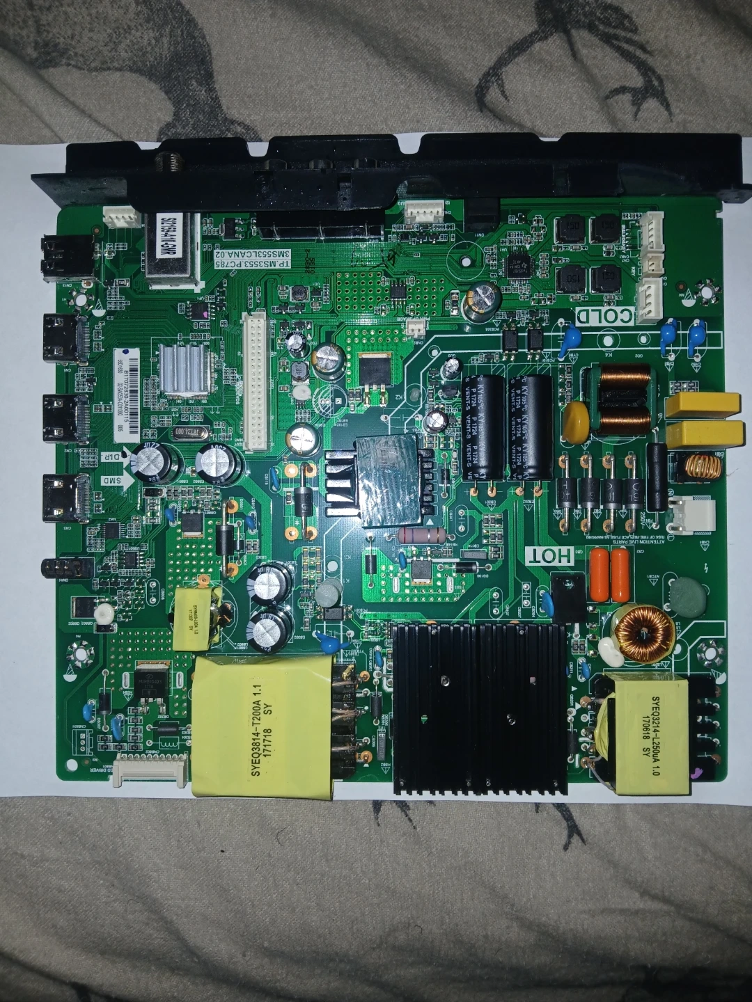 This is a TV motherboard, model TP.MS3553.PC785. It's a replacement part for a television. Components like transformers and heatsinks are visible.