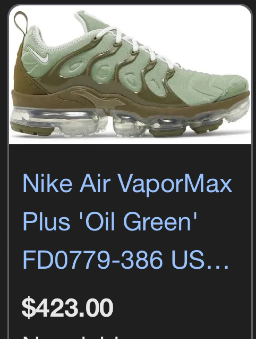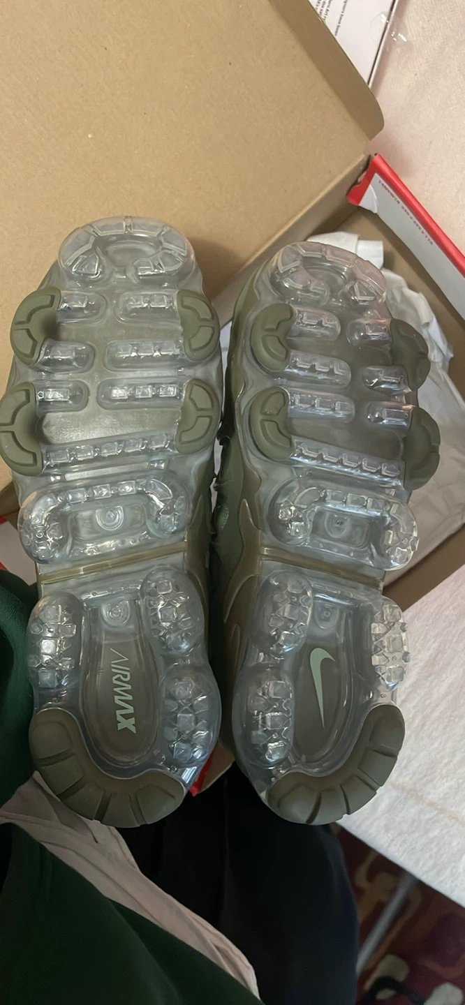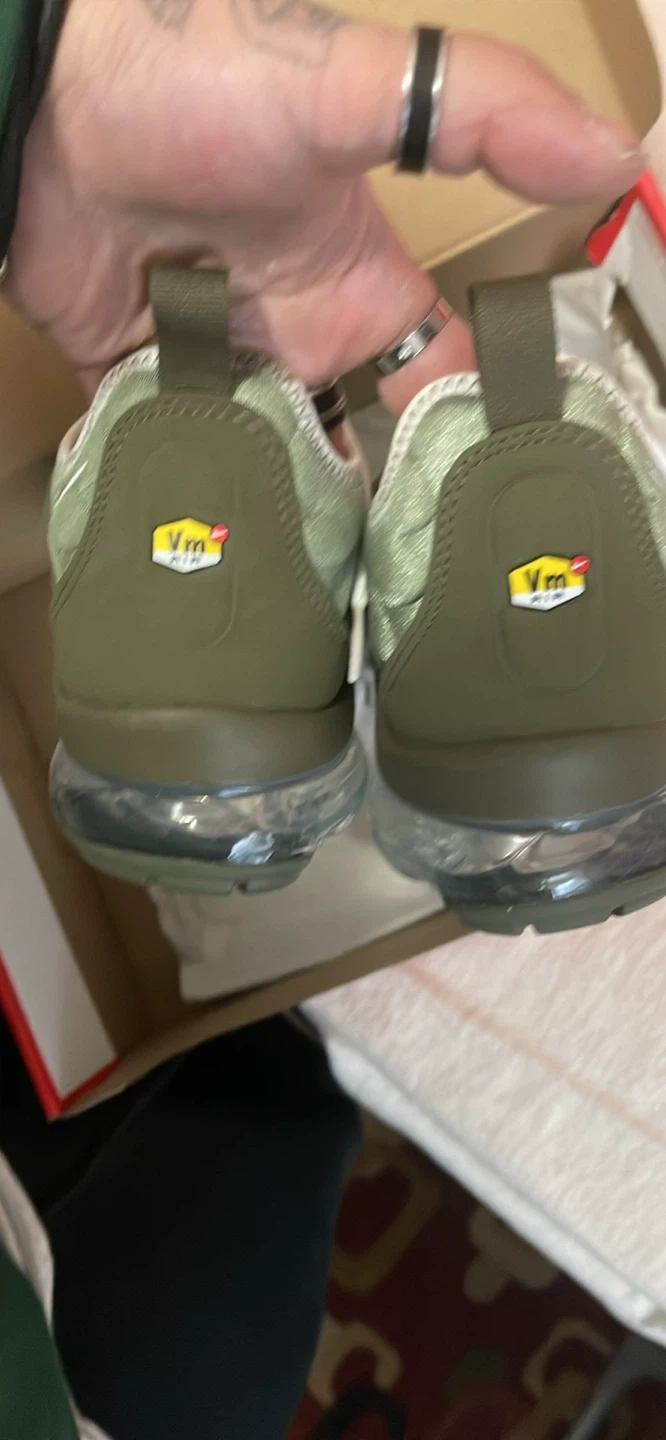 Selling a pair of Nike Air VaporMax Plus sneakers in an oil green color. They are a US size 8 and come with the original box. These shoes feature the iconic VaporMax cushioning for all-day comfort and a stylish, wavy design. Perfect for adding a unique touch to your footwear collection! Brand new in the box never worn oil green vapormax plus