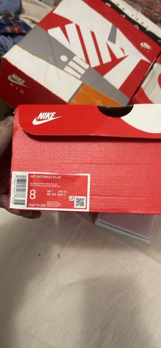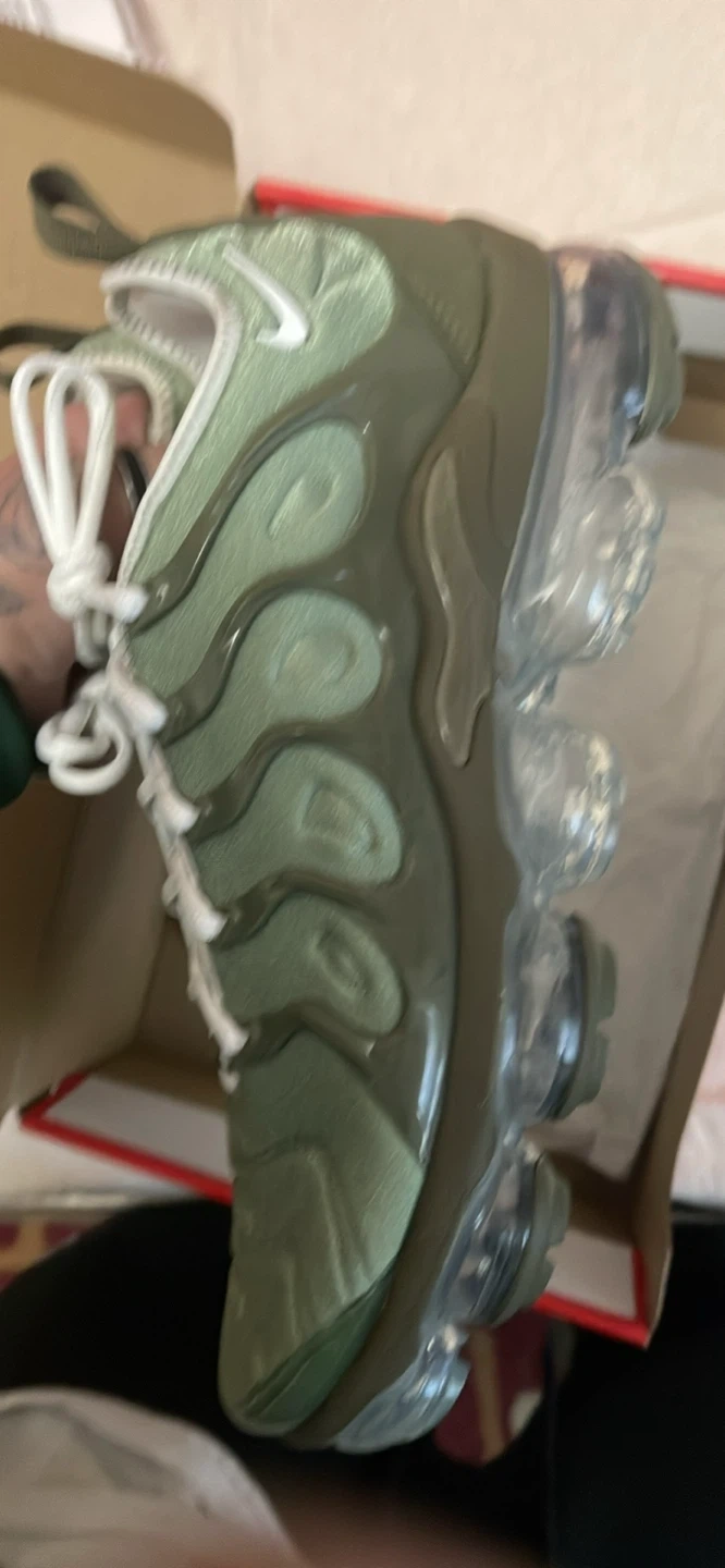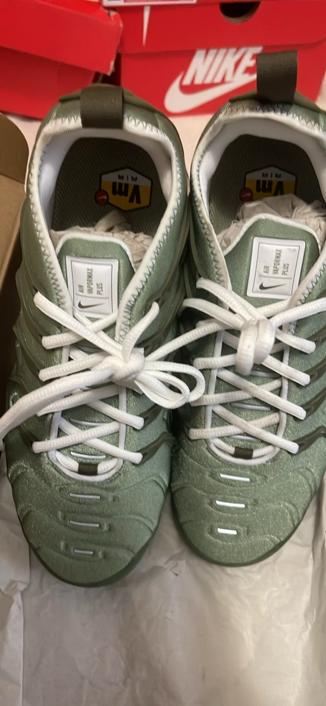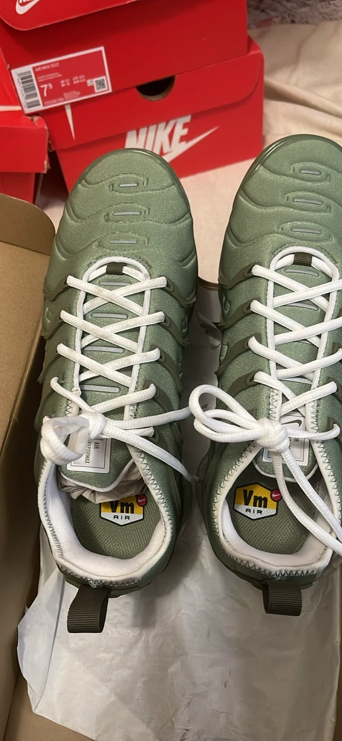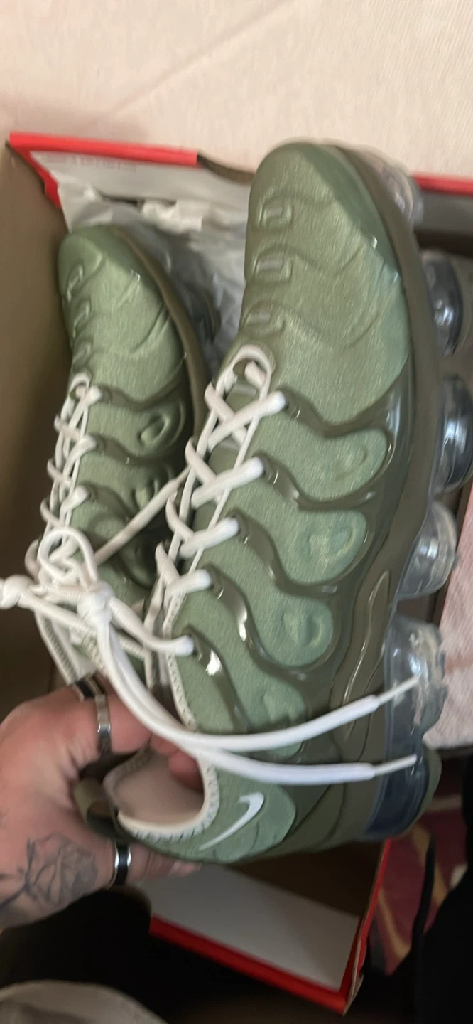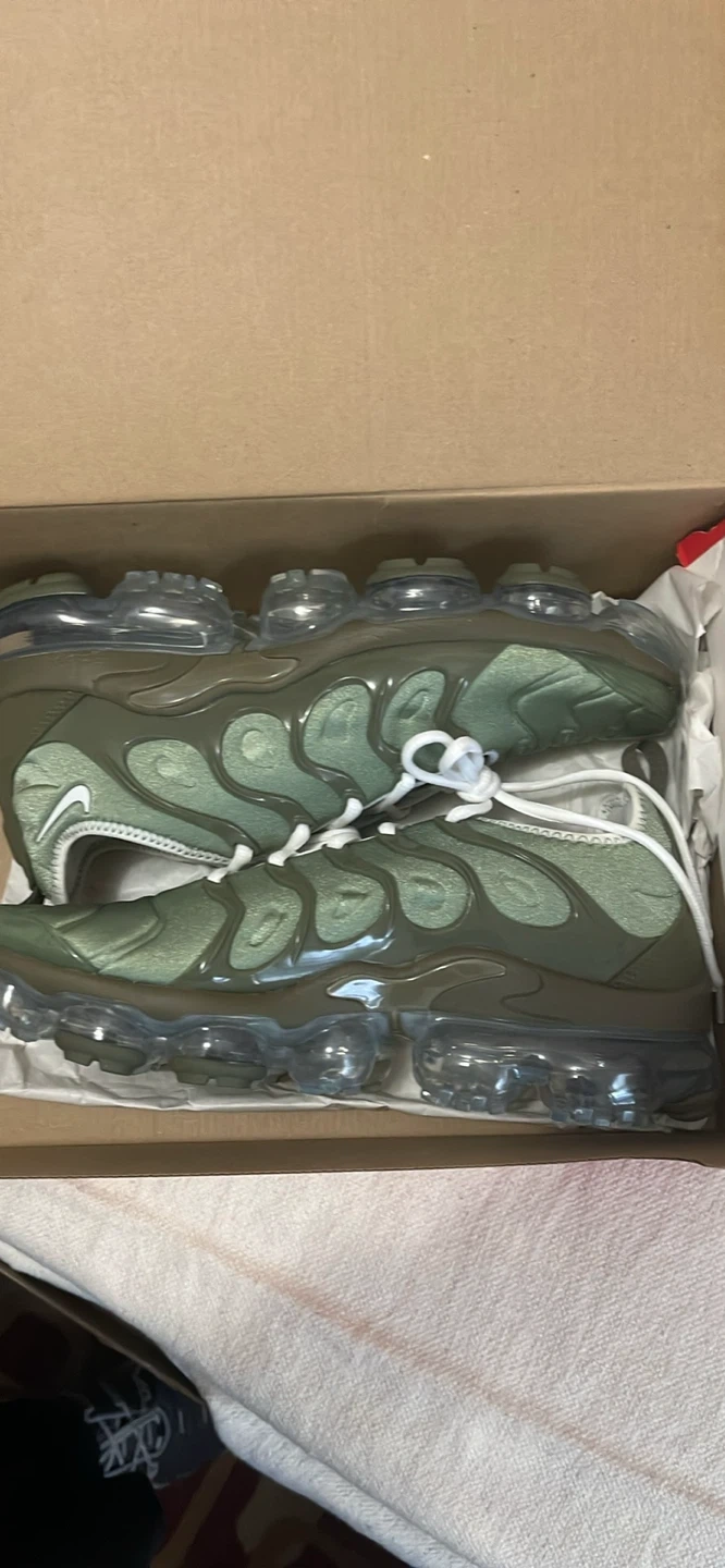 Selling a pair of Nike Air VaporMax Plus sneakers in an oil green color. They are a US size 8 and come with the original box. These shoes feature the iconic VaporMax cushioning for all-day comfort and a stylish, wavy design. Perfect for adding a unique touch to your footwear collection! Brand new in the box never worn oil green vapormax plus