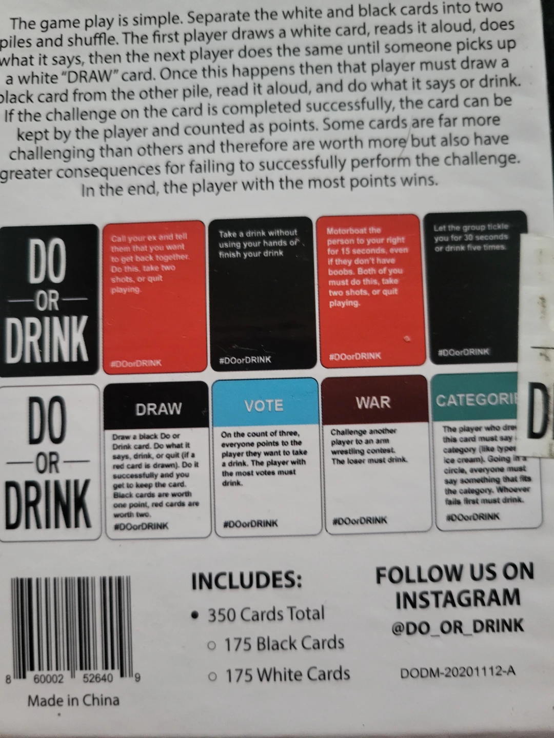 Selling a Do or Drink card game! It's the Win or Blackout edition. The game includes 350 cards total, with 175 black cards and 175 white cards. Get ready for some fun challenges!
