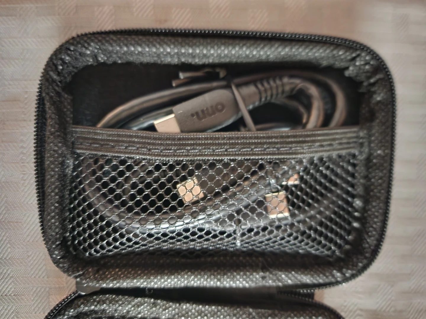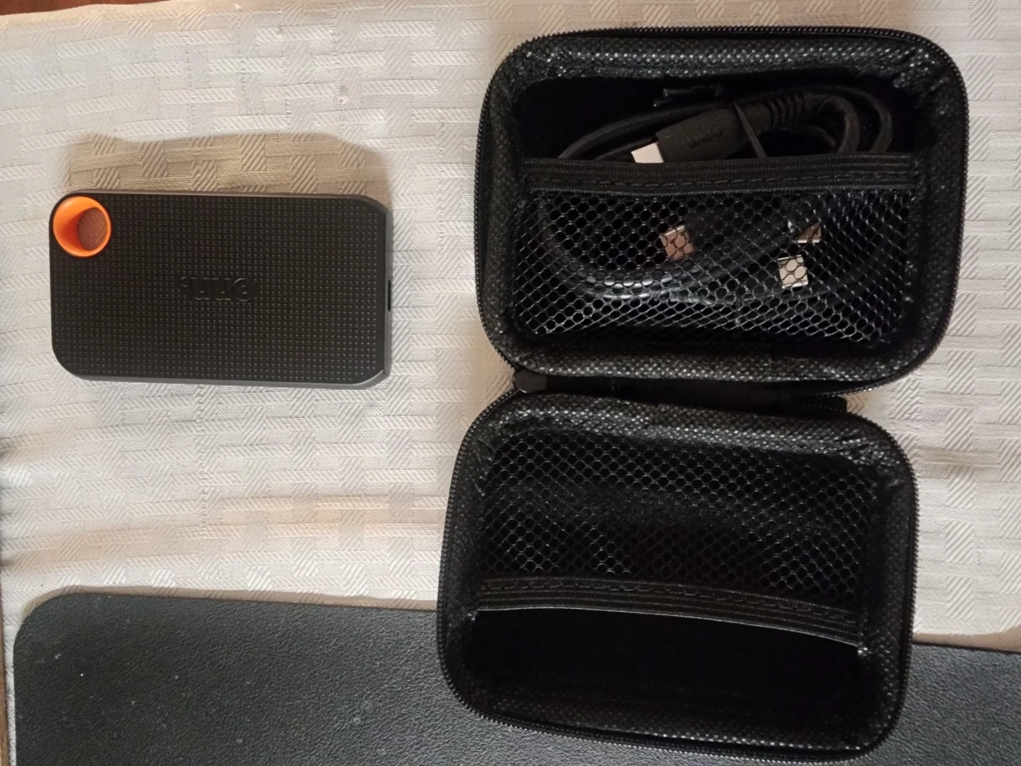 This is an onn. 500 GB portable solid-state drive. It's a USB-C interface with a 2000 MB/s read speed and 1900 MB/s write speed. Includes the drive, a carrying case, and USB cables. Sold as is. No return.