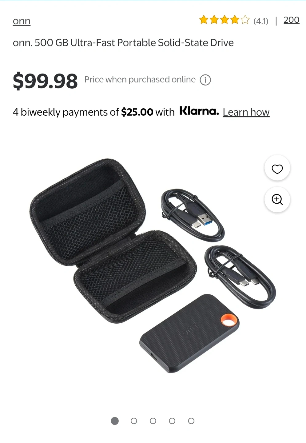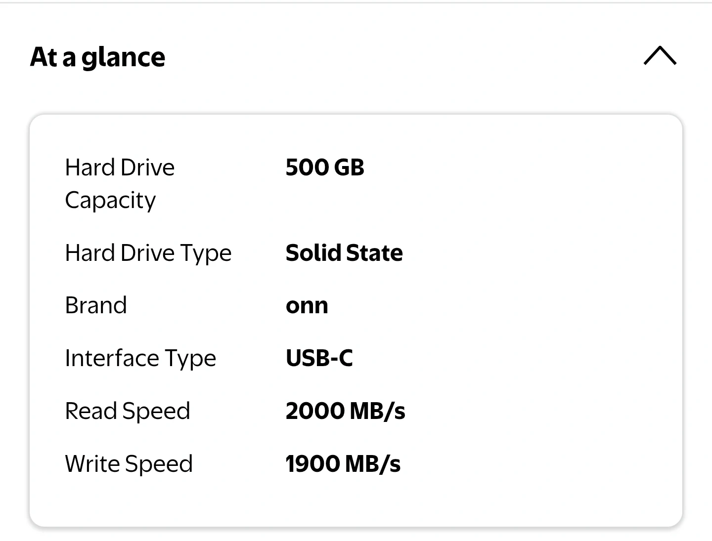 This is an onn. 500 GB portable solid-state drive. It's a USB-C interface with a 2000 MB/s read speed and 1900 MB/s write speed. Includes the drive, a carrying case, and USB cables. Sold as is. No return.
