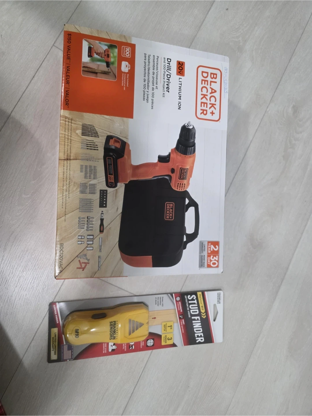This Black+Decker drill/driver kit comes with a 100-piece accessory set, including bits and a charger. It's a 20V Lithium Ion model. A convenient carrying bag is also included. This also includes Stud finder. Comes in original box - NEVER OPENED.