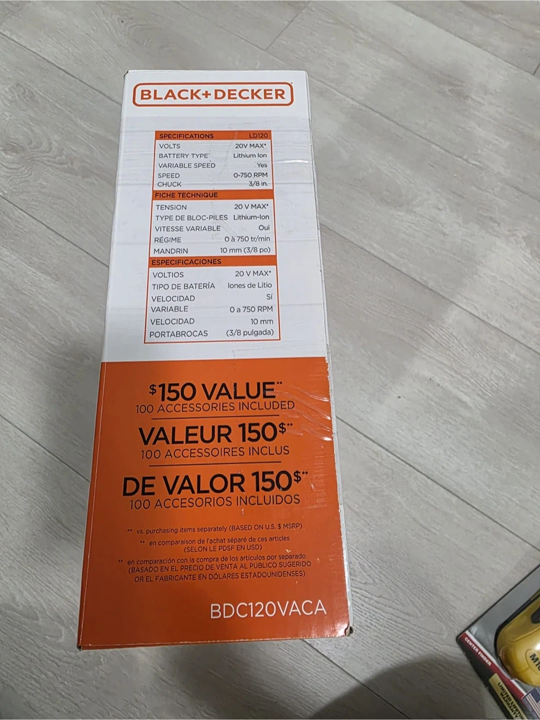 This Black+Decker drill/driver kit comes with a 100-piece accessory set, including bits and a charger. It's a 20V Lithium Ion model. A convenient carrying bag is also included. This also includes Stud finder. Comes in original box - NEVER OPENED.