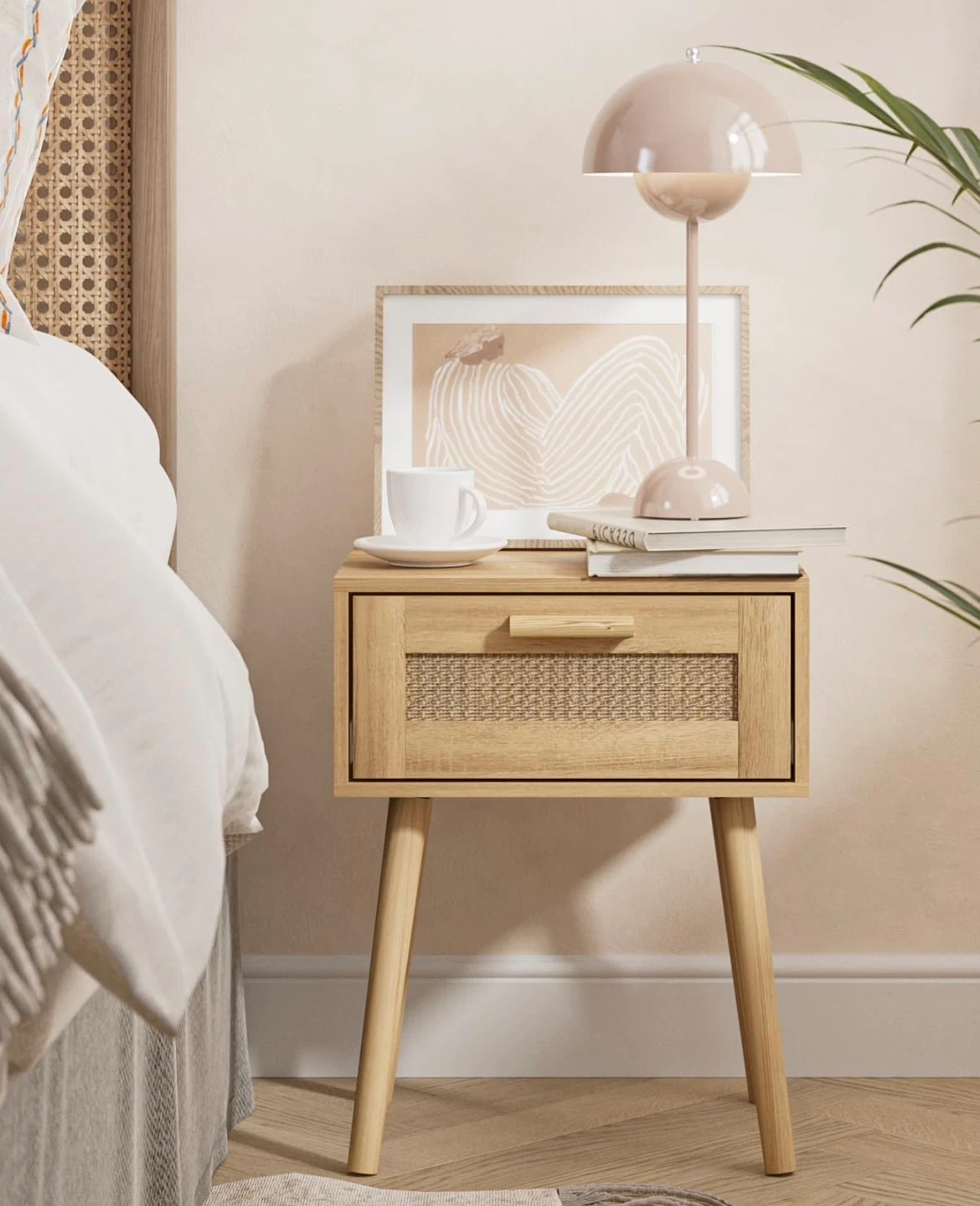 Light Wood Nightstand with Rattan Drawer