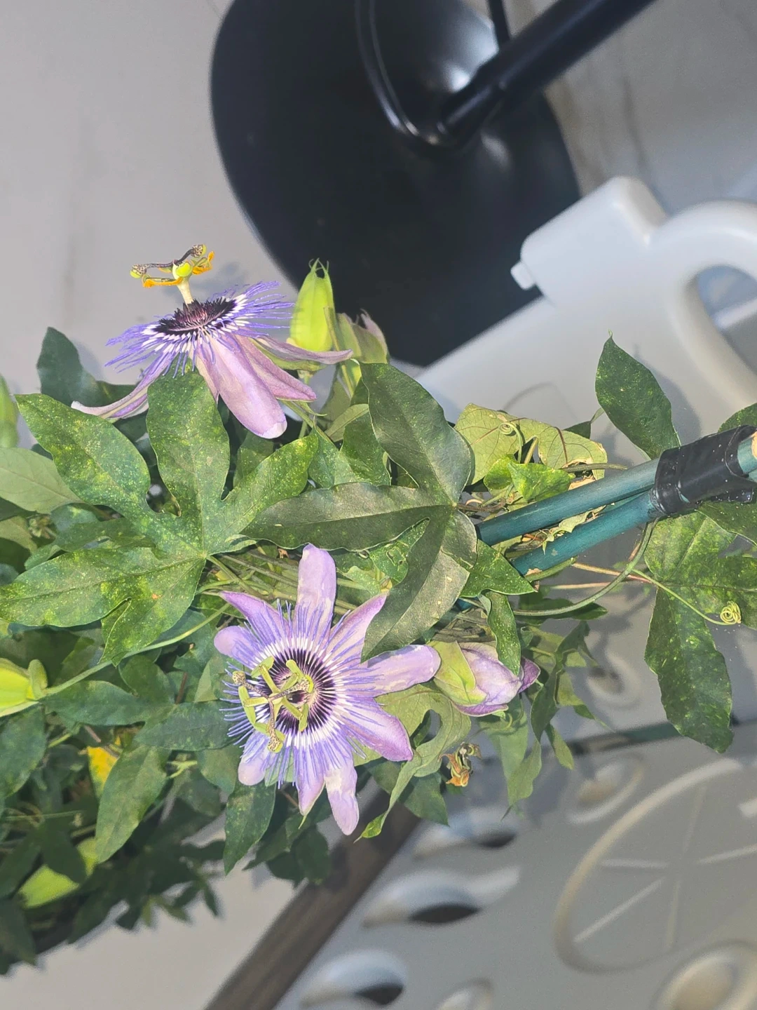 Lovely passion flower plant with vibrant purple blooms. It's currently in a black pot with soil. A support stake is included to help it climb. This plant would be a beautiful addition to any garden or home!