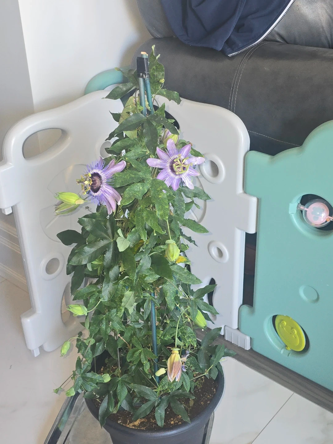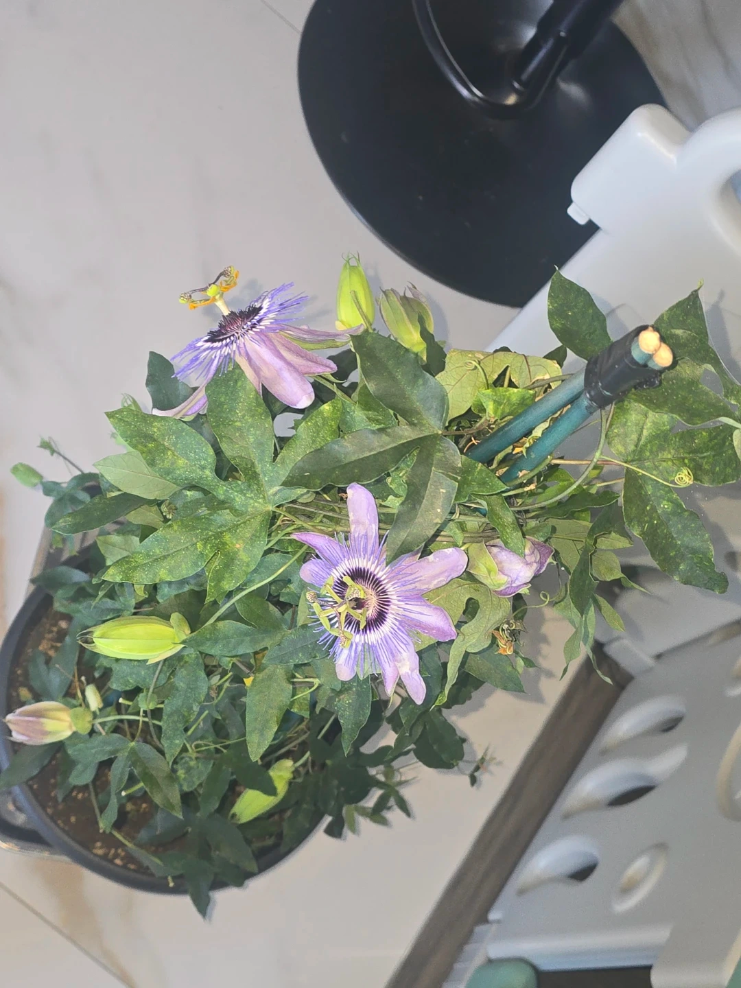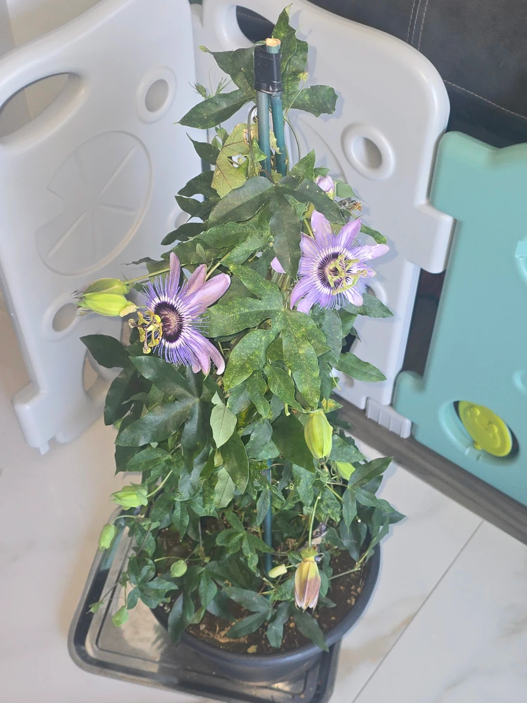 Lovely passion flower plant with vibrant purple blooms. It's currently in a black pot with soil. A support stake is included to help it climb. This plant would be a beautiful addition to any garden or home!