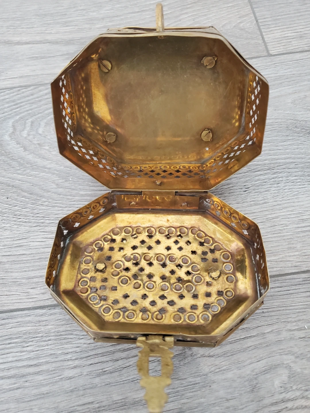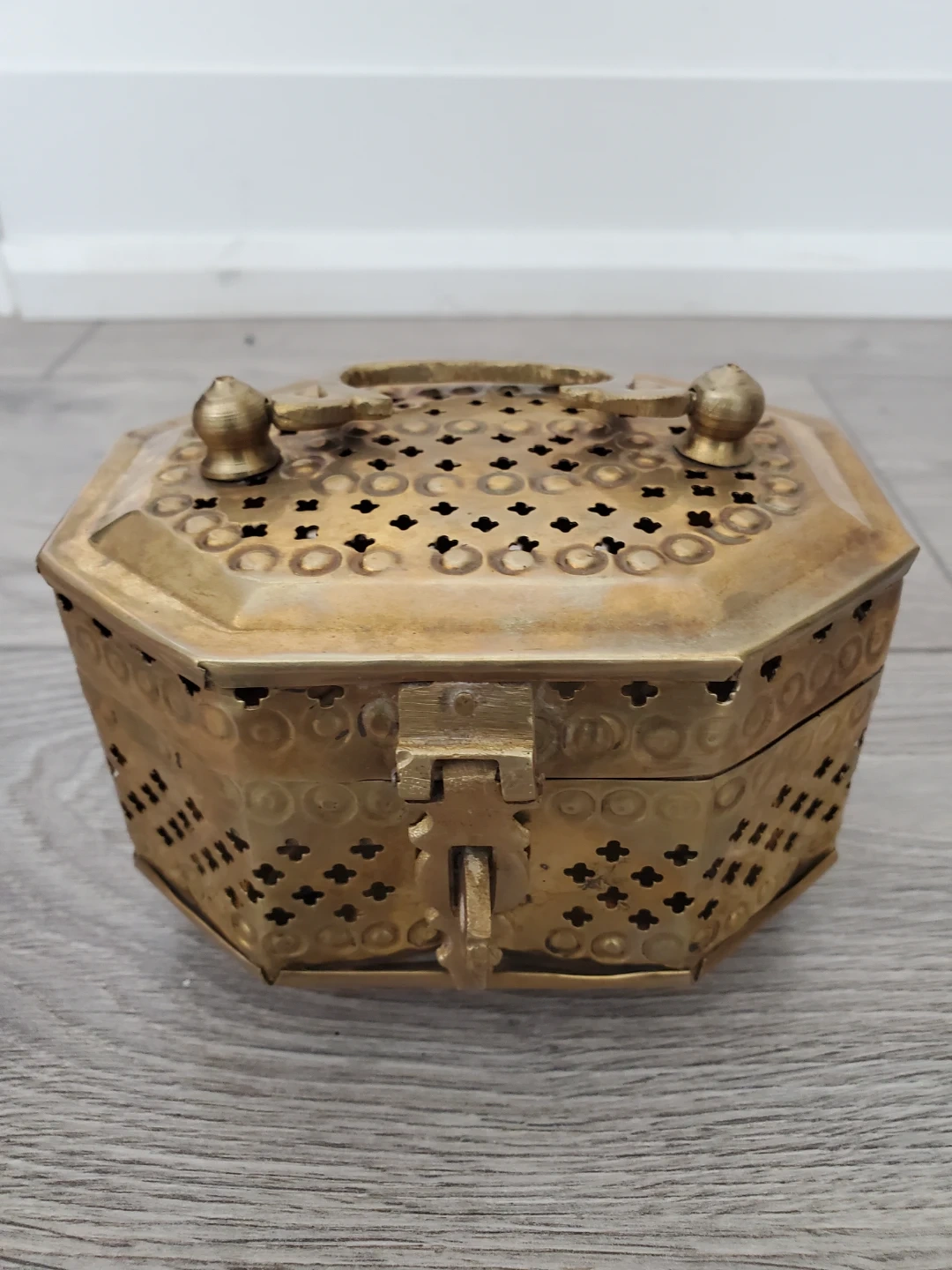 Selling a unique vintage brass decorative box. It has an octagonal shape with intricate cut-out designs on the sides and lid. The box shows some signs of wear, which adds to its vintage charm. Perfect for storing small trinkets or as a decorative piece!