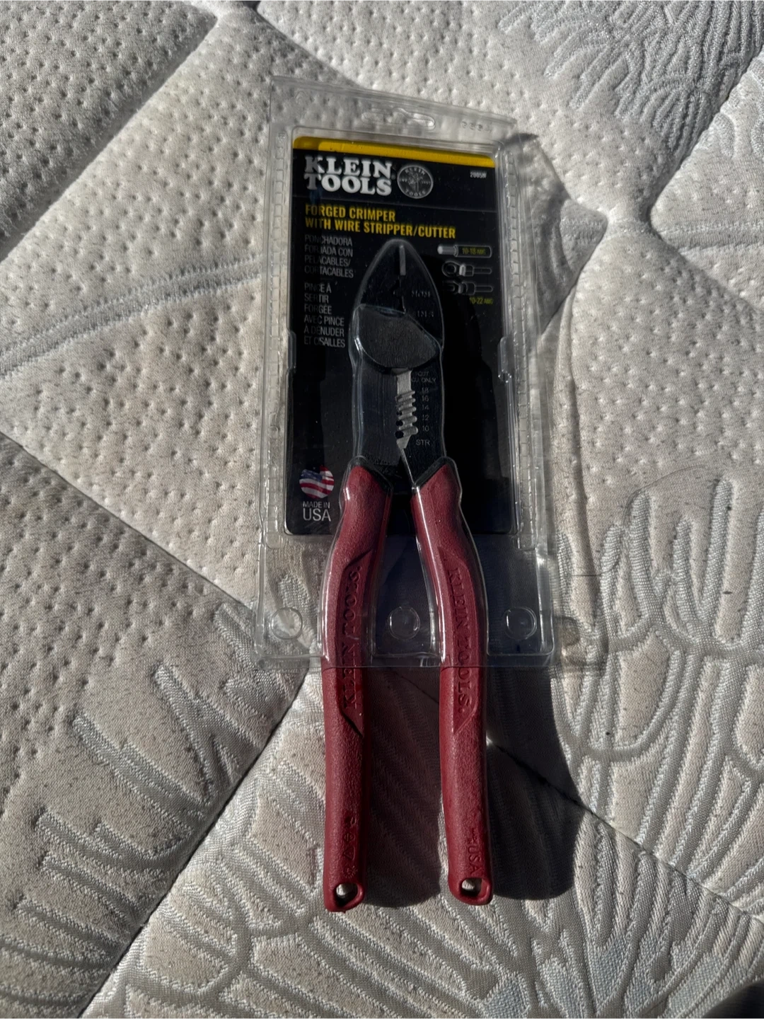 This Klein Tools forged crimper is also a wire stripper and cutter. It's made in the USA. It strips wire gauges from 10-22 AWG.