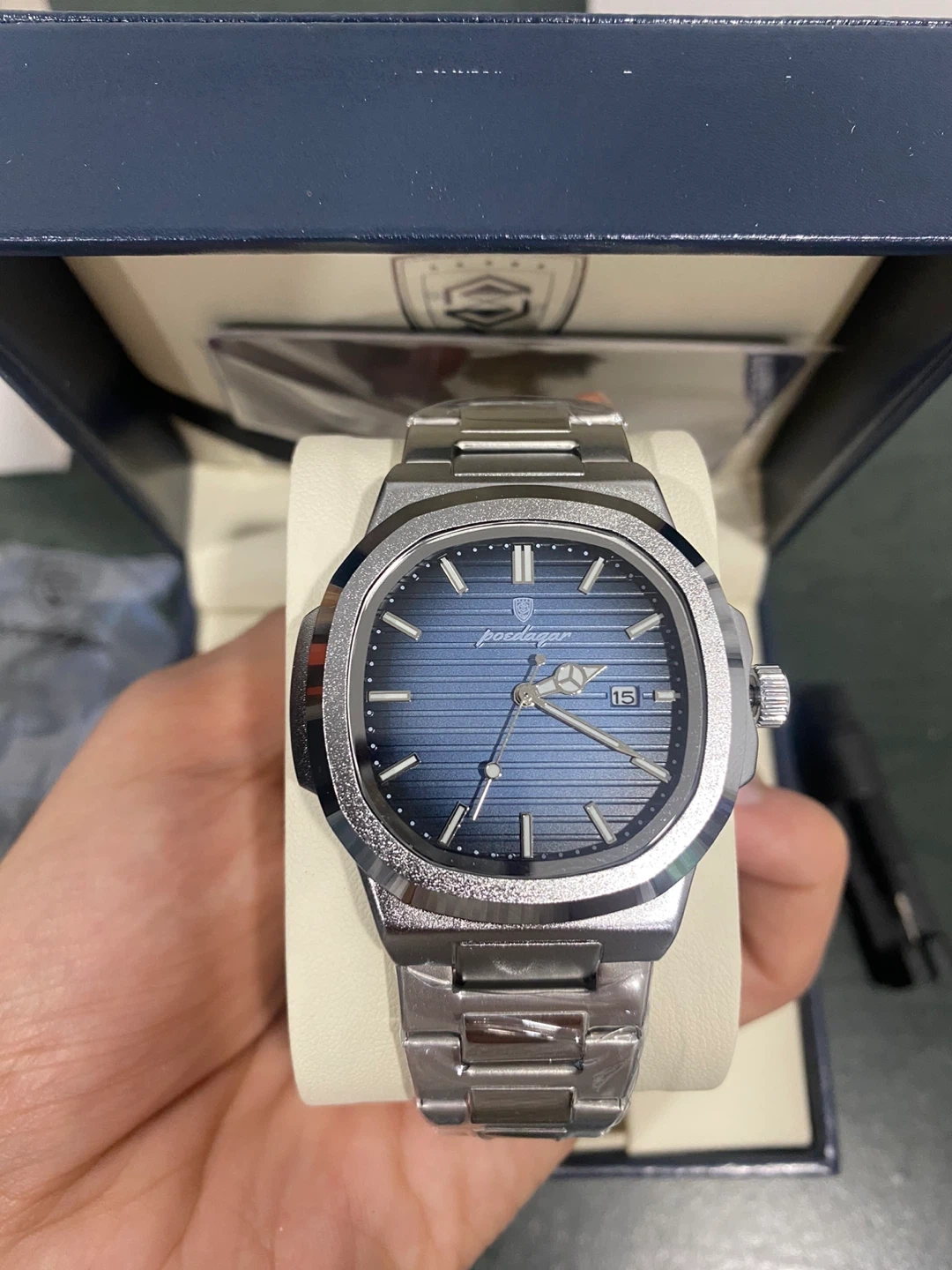 This Poedagar watch features a stylish blue dial and a durable stainless steel band. It comes with a tool for adjusting the bracelet length. The watch is presented in its original box with a warranty card included.
