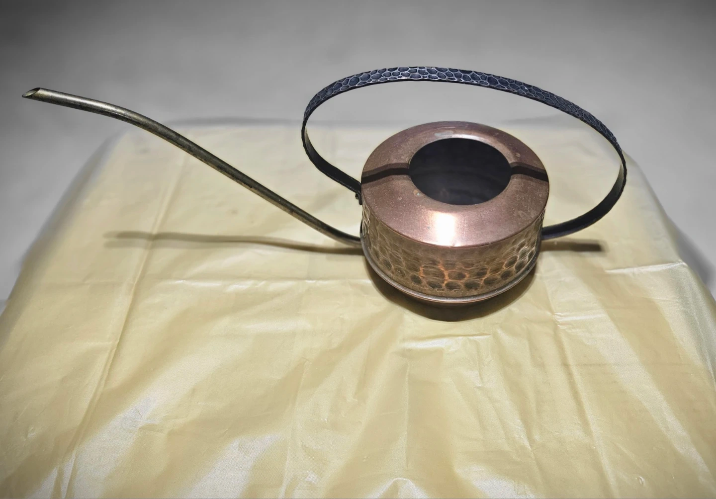 Copper watering can with a hammered texture. It has a long spout and a decorative metal handle. This watering can is a lovely addition for indoor plants.