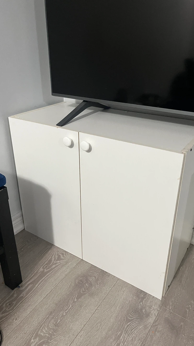 A white storage cabinet with two doors and internal shelving. It's a simple design, good for organizing items. The cabinet has white knobs on the doors.