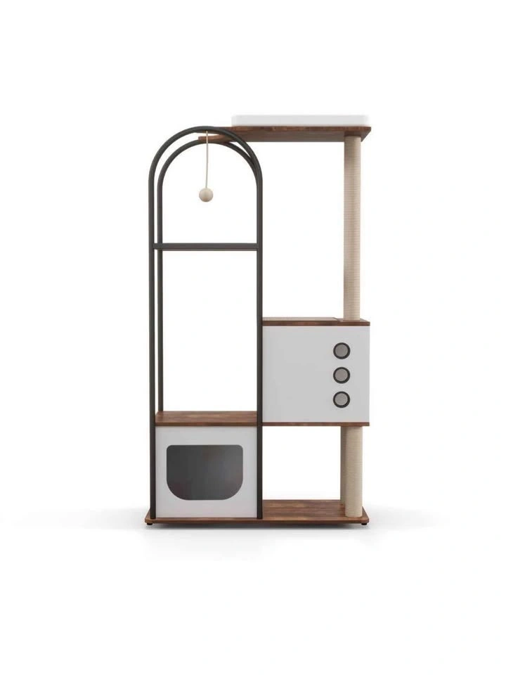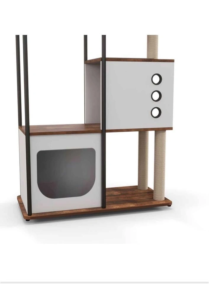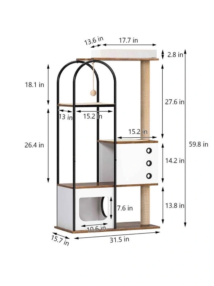 Brand new cat tree, still in the box and unopened! Asking $50. Available for pickup in the Berwyn/Cicero area between 10 am and 7 pm. This versatile cat condo features a padded perch, cave, and scratch post enclosure, perfect for your feline friend. It has a rustic brown and white finish and a modern design that will add style to your space. The semi-enclosed cupboards offer a private, air-circulated hideaway. Made from high-quality natural particle board, its stable rectangular design ensures it won't shake or tilt, even with multiple levels of jumping. With five levels, it's ideal for multi-cat households, giving each cat their own activity platform. The overall dimensions are 60" H x 31.5" W x 15.5" D, and it weighs 47.44 pounds. The cat tree includes built-in scratching surfaces like sisal-wrapped posts to help protect your furniture. The top features a soft bed for comfortable napping. The semi-enclosed cabinets allow for easy observation of your cat while maintaining air circulation to prevent odors. The design is also easy to clean.