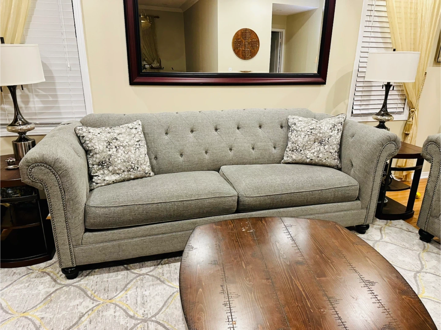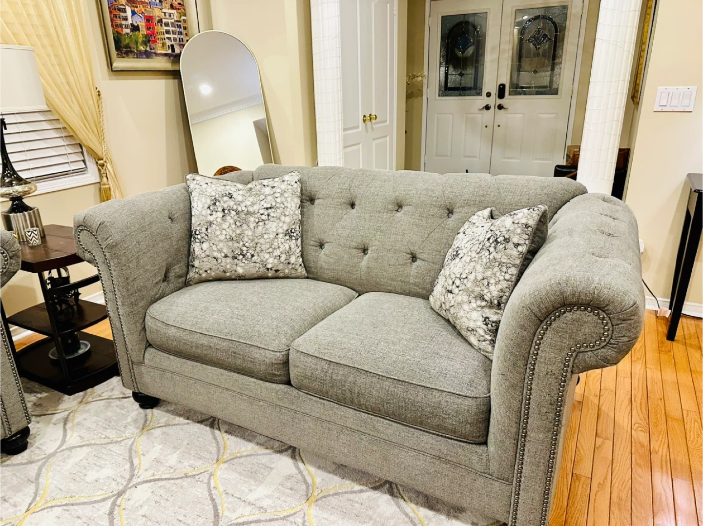 This grey tufted loveseat, sofa and 2 chairs offers comfortable seating and comes with decorative accent pillows. It's upholstered in a durable fabric. The tufted back and nailhead trim add a touch of classic style to any living room. It's perfect for smaller spaces or as an addition to a larger seating arrangement. Price is negotiable.