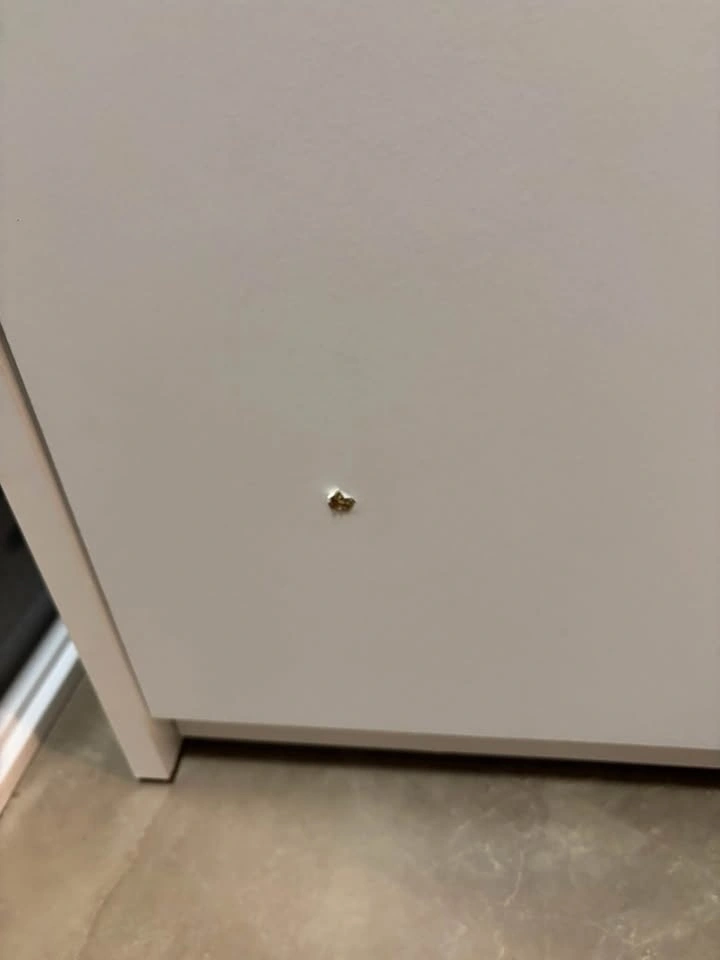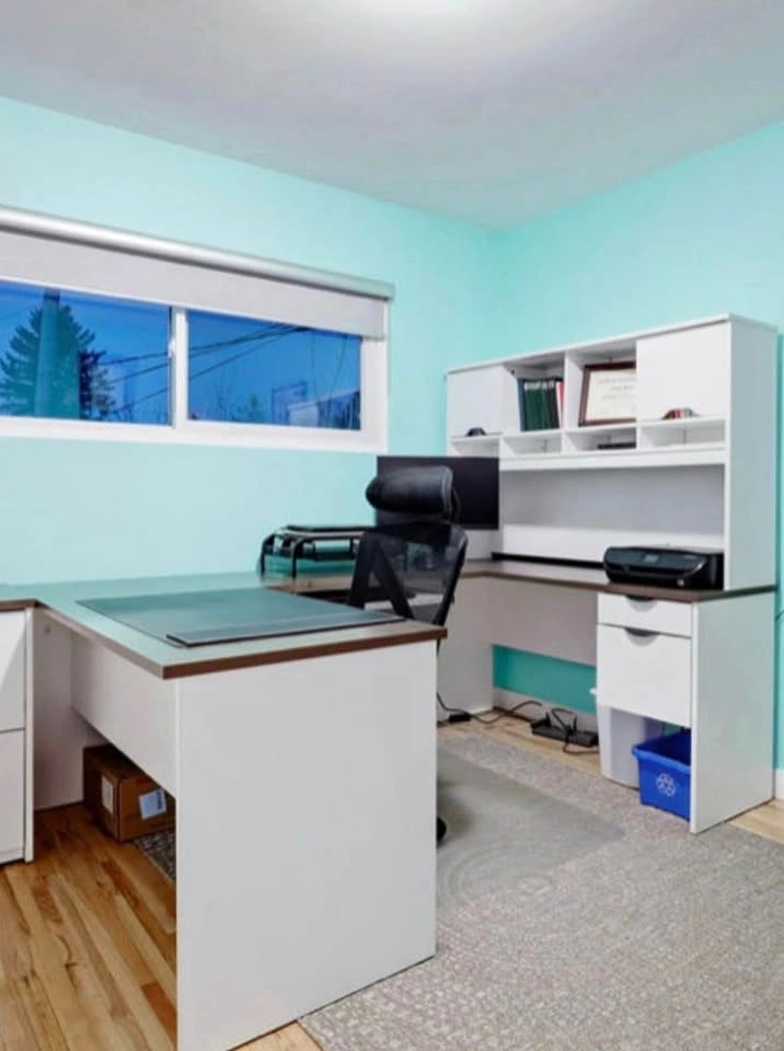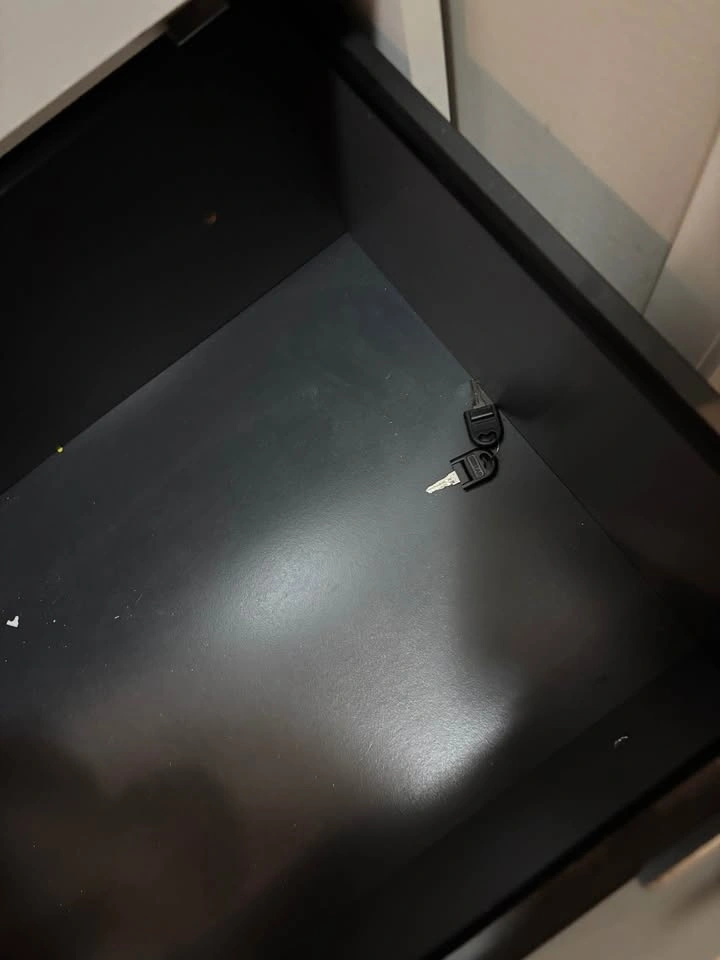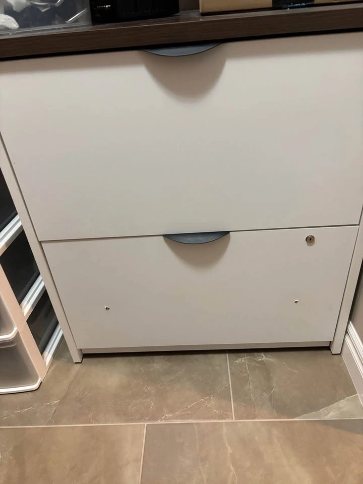 Also includes a matching filing cabinet that fits legal-size folders. One of the drawers gets a bit stuck when opening, and there are two small holes on the front. Filing cabinet size: 19.75”D 28.5”W and 30.5”H.