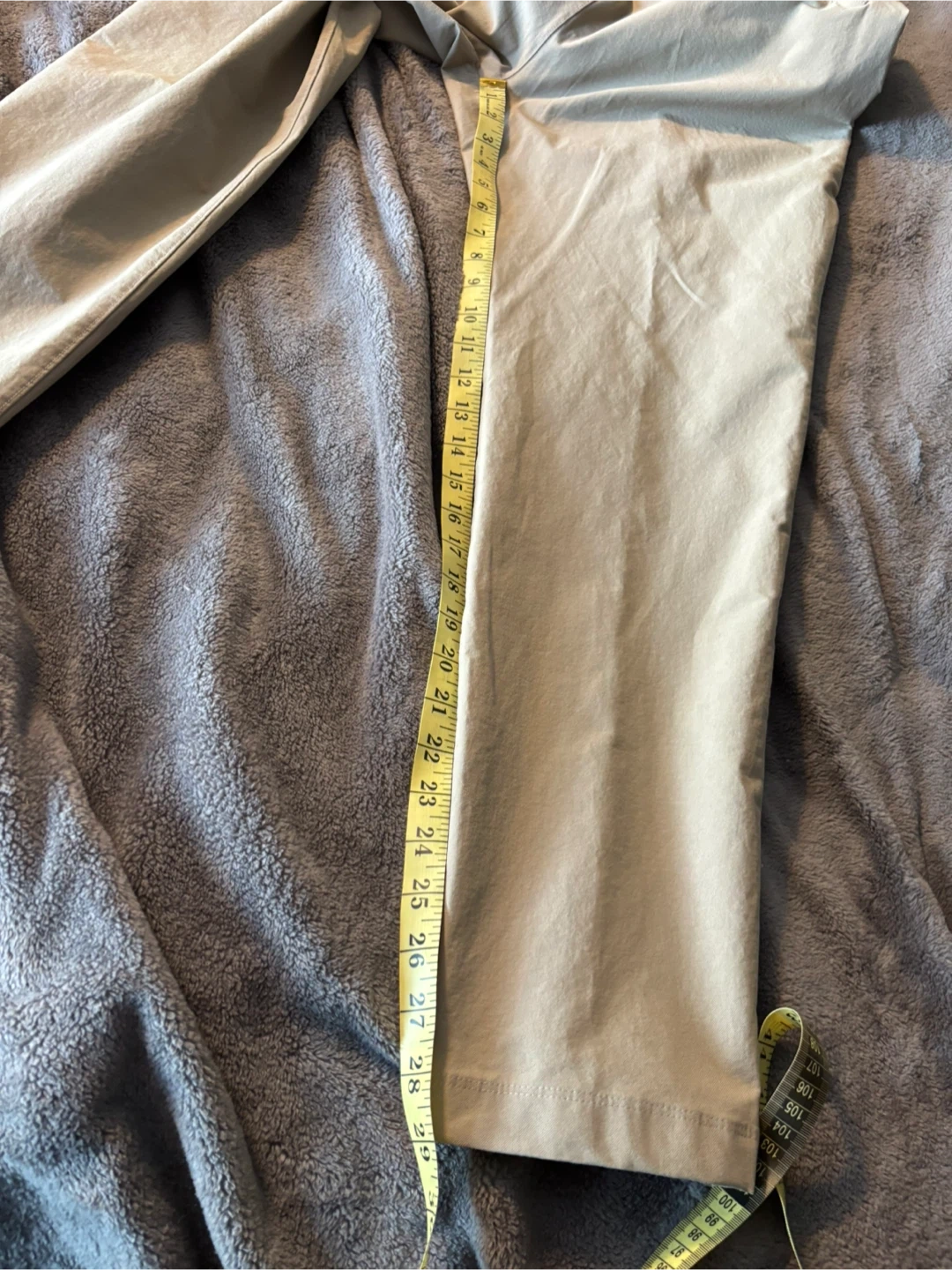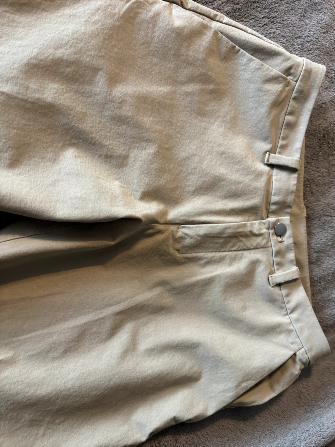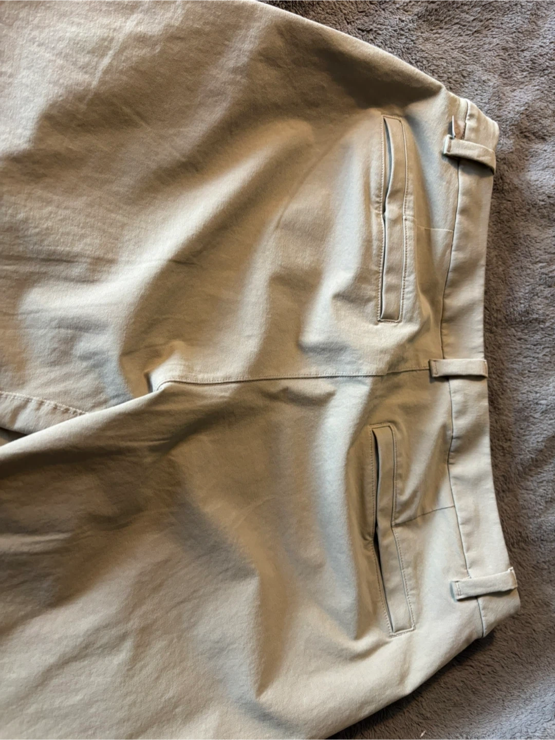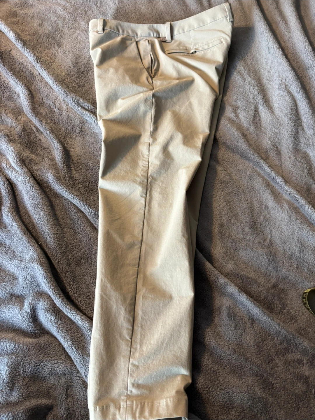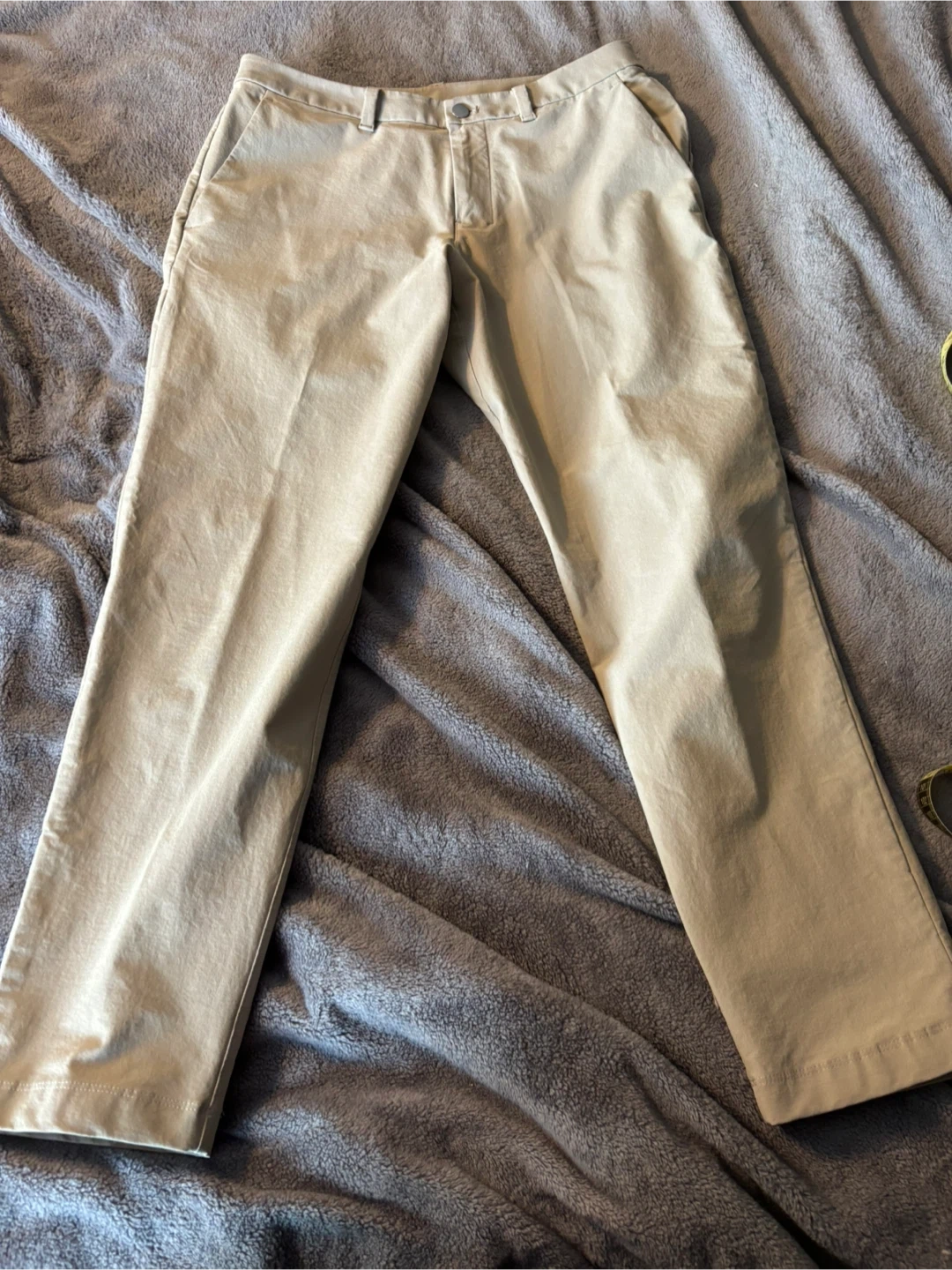 Lululemon Men's ABC Slim-Fit 5-Pocket Trouser pants come in a size 32. They're a Tan colour with a zip fly closure. The material is comfortable for everyday wear.