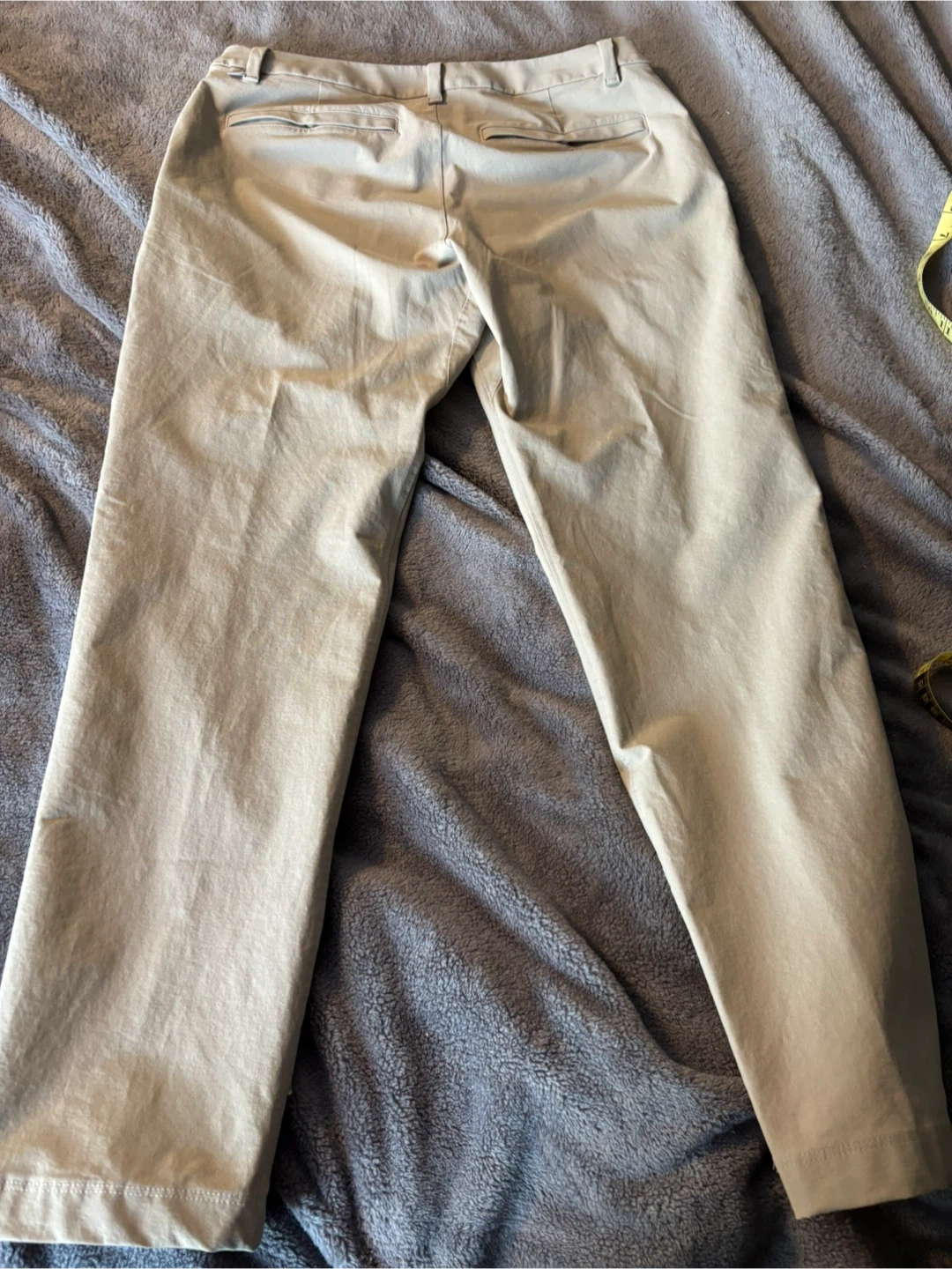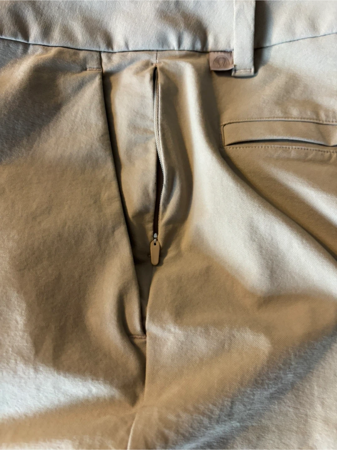 Lululemon Men's ABC Slim-Fit 5-Pocket Trouser pants come in a size 32. They're a Tan colour with a zip fly closure. The material is comfortable for everyday wear.