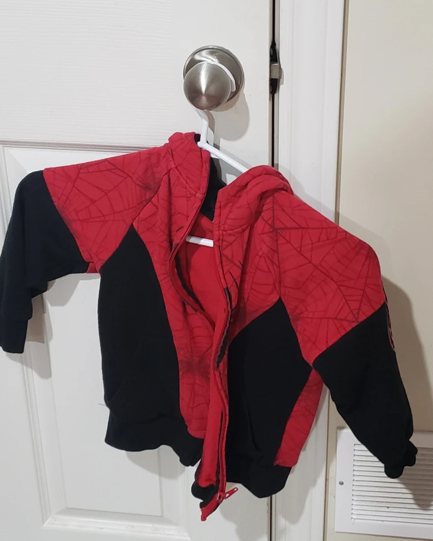 A red and black zip-up hoodie. Features a spiderweb design on the red panels. Long sleeves and a hood. Consider this hoodie for a relaxed evening at home.