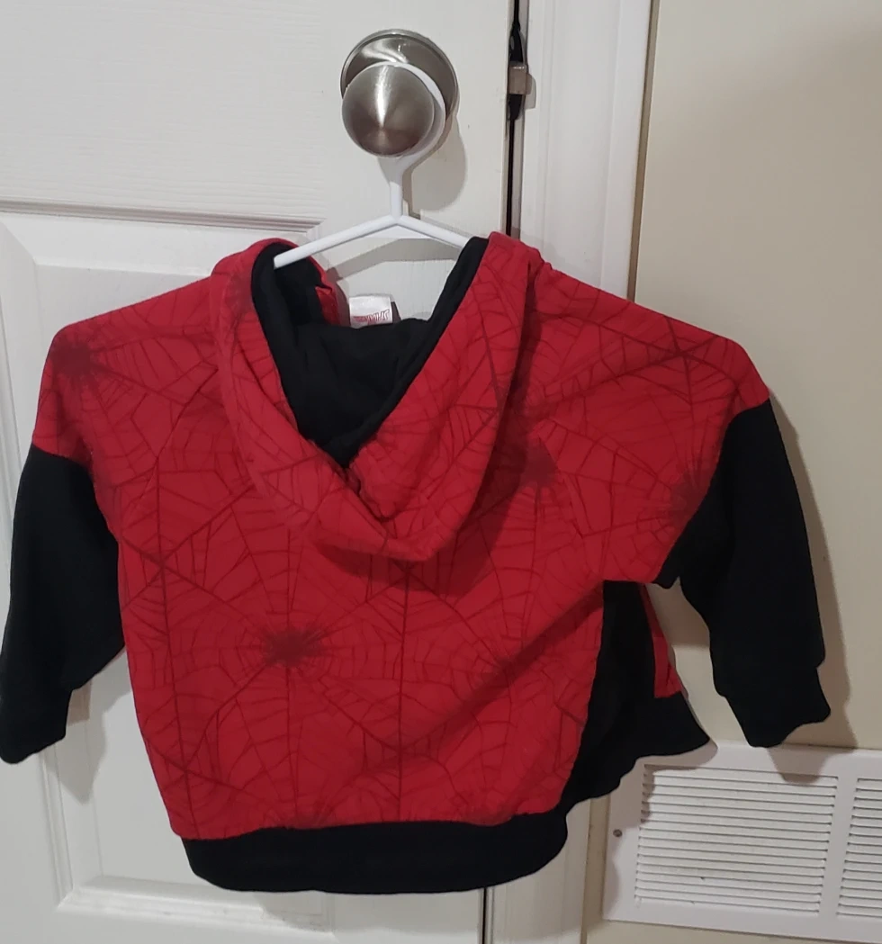 A red and black zip-up hoodie. Features a spiderweb design on the red panels. Long sleeves and a hood. Consider this hoodie for a relaxed evening at home.