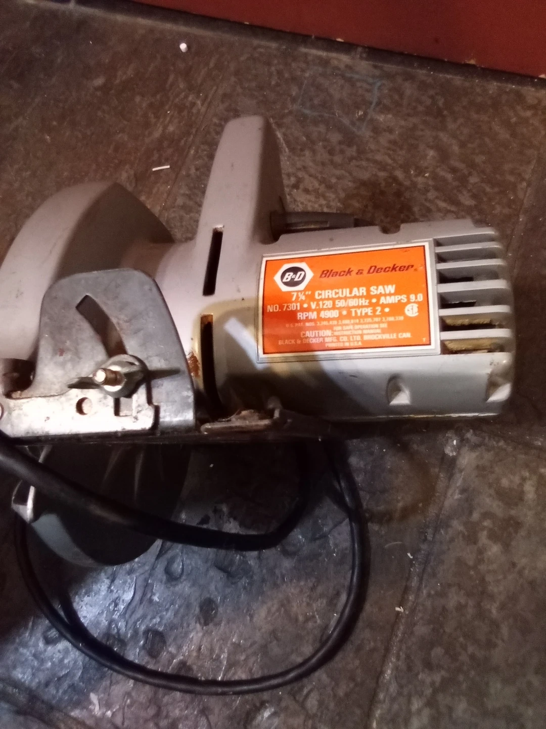 This is a Black & Decker 7 1/4" circular saw. It runs at 7300 RPM on 120V, 60Hz with 9.8 amps. This saw is designed for general construction and DIY projects.