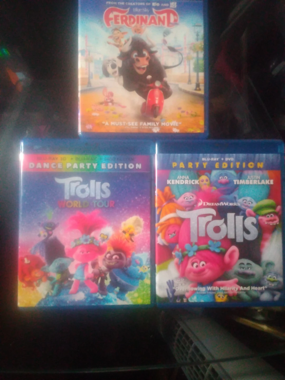 Includes the animated movies Ferdinand, Trolls, and Trolls World Tour. Trolls and Trolls World Tour are Party Edition/Dance Party Edition Blu-Ray + DVD. Great collection for family movie nights!