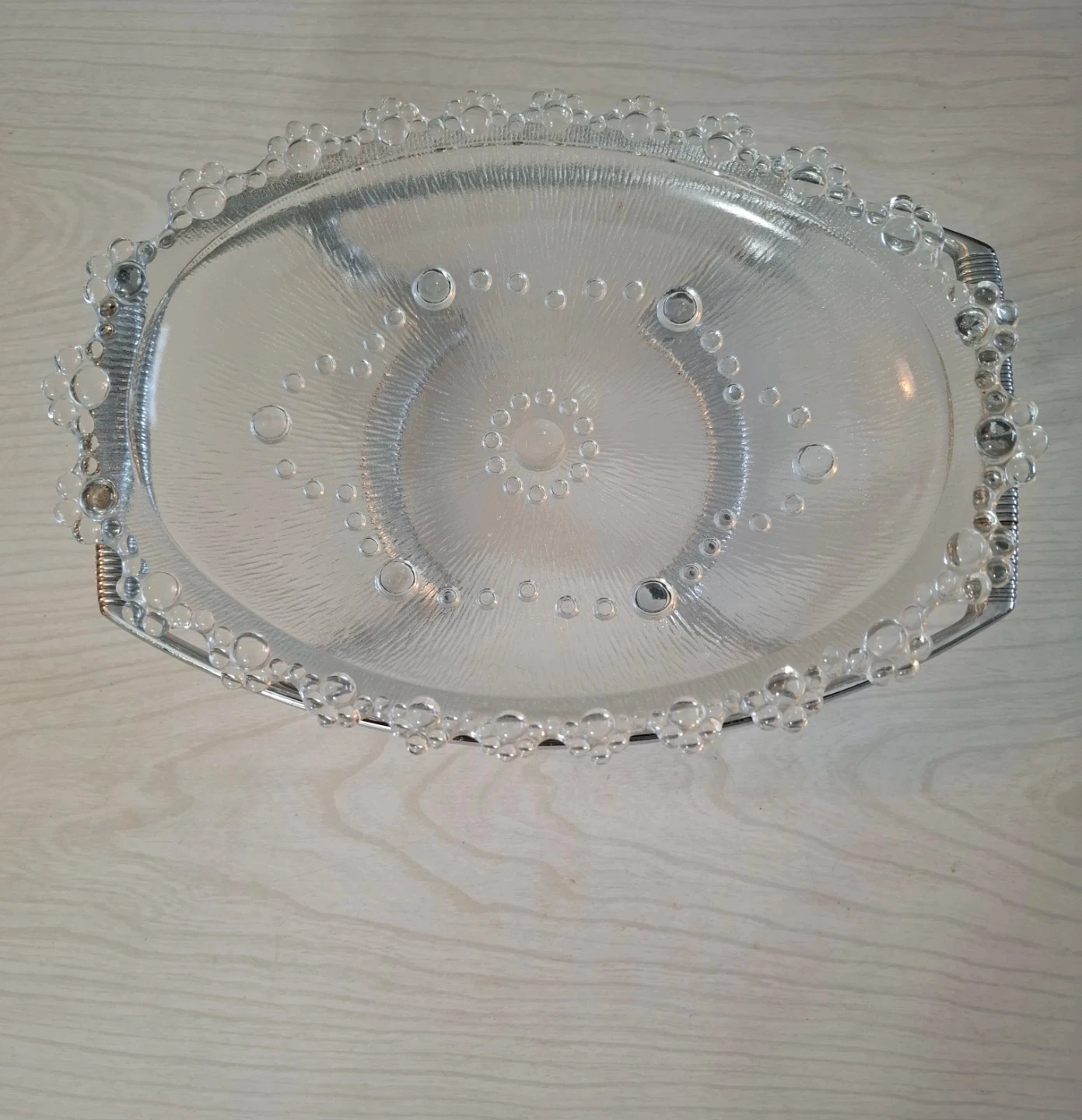 This clear glass serving platter has a decorative floral-inspired border and a textured centre. It comes with a chrome-finished metal stand with handles. Great for serving appetizers or desserts!