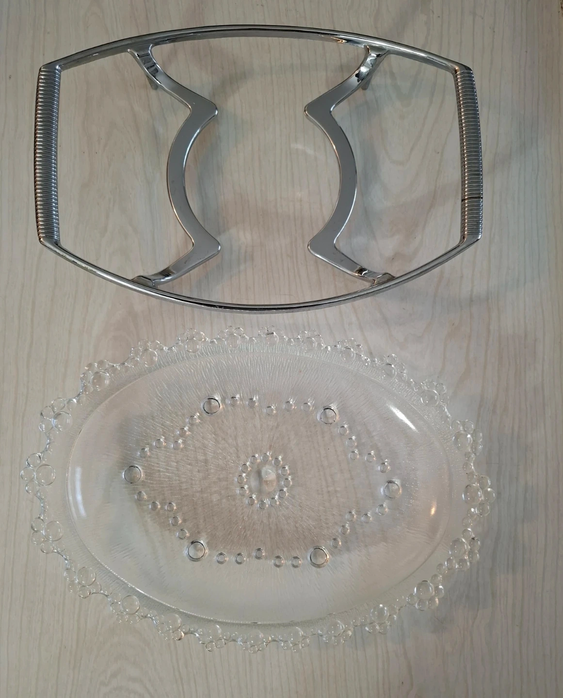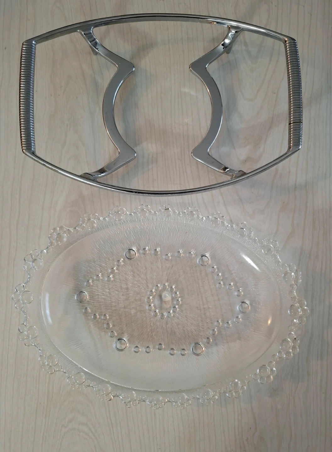 This clear glass serving platter has a decorative floral-inspired border and a textured centre. It comes with a chrome-finished metal stand with handles. Great for serving appetizers or desserts!