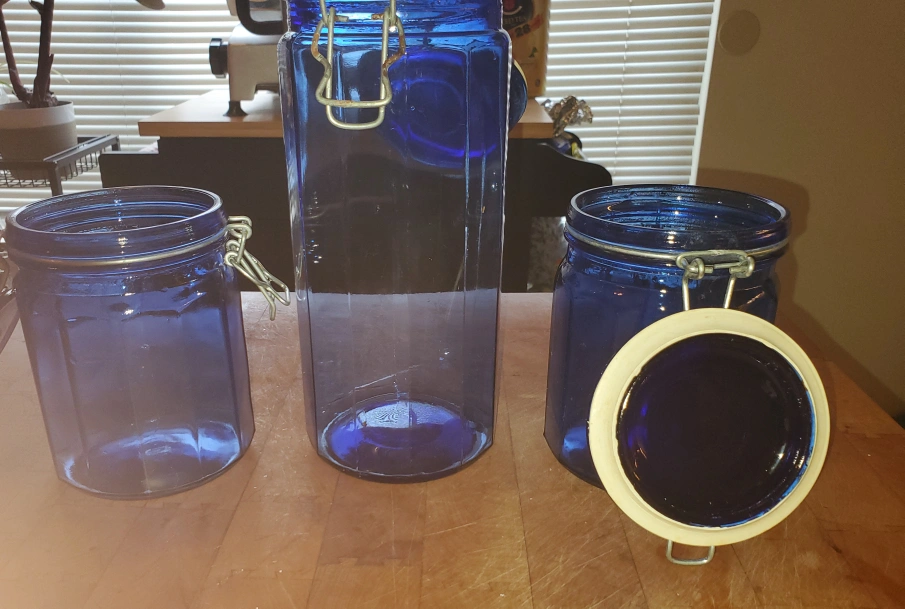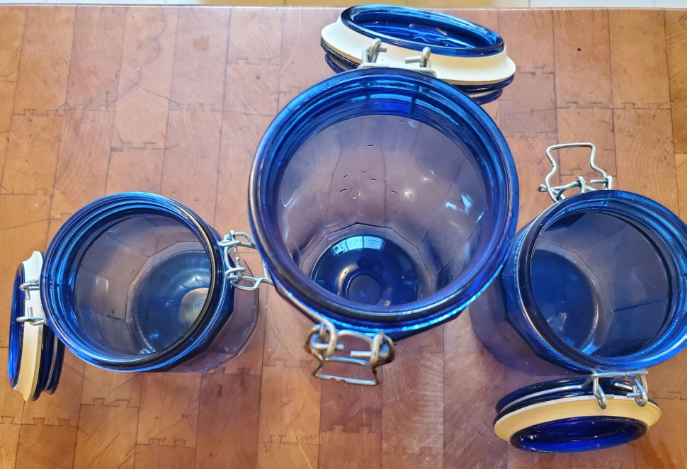 Set of three glass canister jars. The set is made of cobalt blue glass. These jars have metal clasps and white rubber seals. This set would look great on a kitchen shelf, adding a soothing touch to your space.