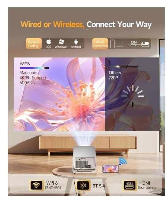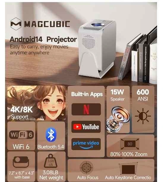 Android 14 4K 8K smart projector, mini projector with Wifi6 and Bluetooth5.4, 600 ANSI, auto focus and obstacle avoidance, 1080P portable movie projector for home and outdoor use, Magcubic HY350Max