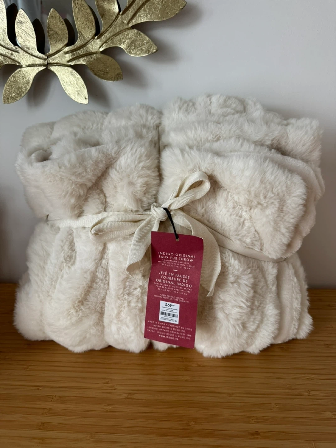 Cozy and soft faux fur throw blanket from Indigo. It's a creamy off-white colour, perfect for adding warmth to any room. This throw is great for snuggling up on the couch or adding a stylish layer to your bedding.